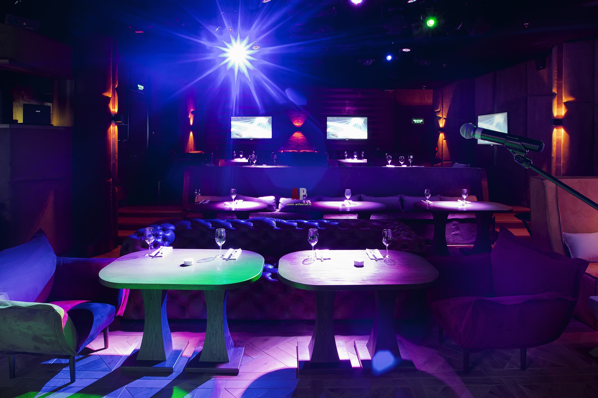 Интерьер караоке-бара. Профессиональная акустика и световое оборудование высокого качества имеют ключевое значение в интерьере.
