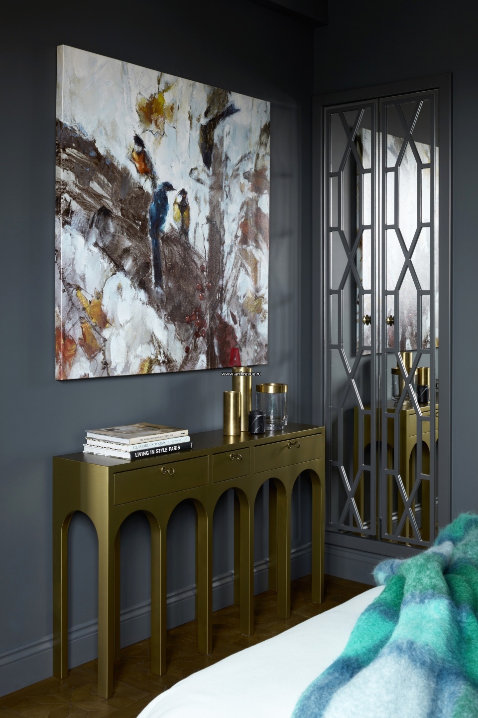 Интерьер спальни. Кровать, платяной шкаф и оригинальная консоль горчичного цвета сделаны на заказ.