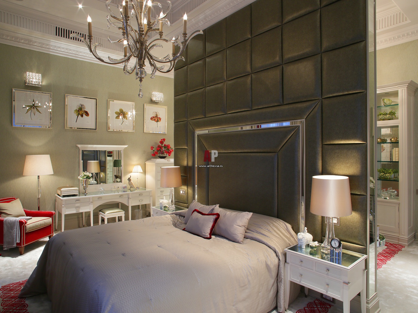 В интерьере спальни преобладают тканевые отделки: стены и перегородка обиты шелком. Для каждого помещения в квартире был разработан собственный лепной декор потолков. Все решетки систем вентиляции и кондиционирования выполнены из гипса и интегрированы в рисунок потолков, что делает их незаметными.