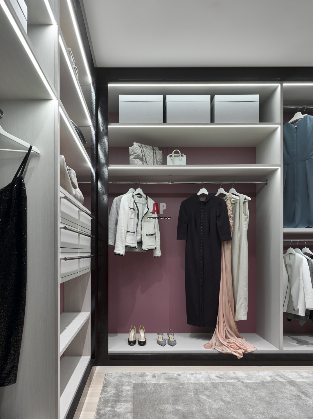 Хозяйская гардеробная с сиреневыми акцентами. Мебель выполнен на заказ, по эскизам дизайнера.