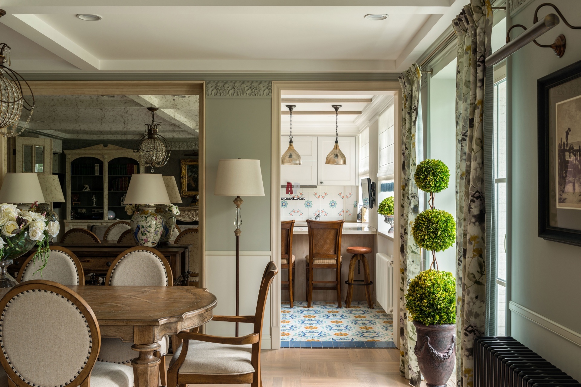 Интерьер с настроением летнего сада. Особый шарм приносят стабилизированные каскадные растения с классической круглой формовкой, Uttermost.