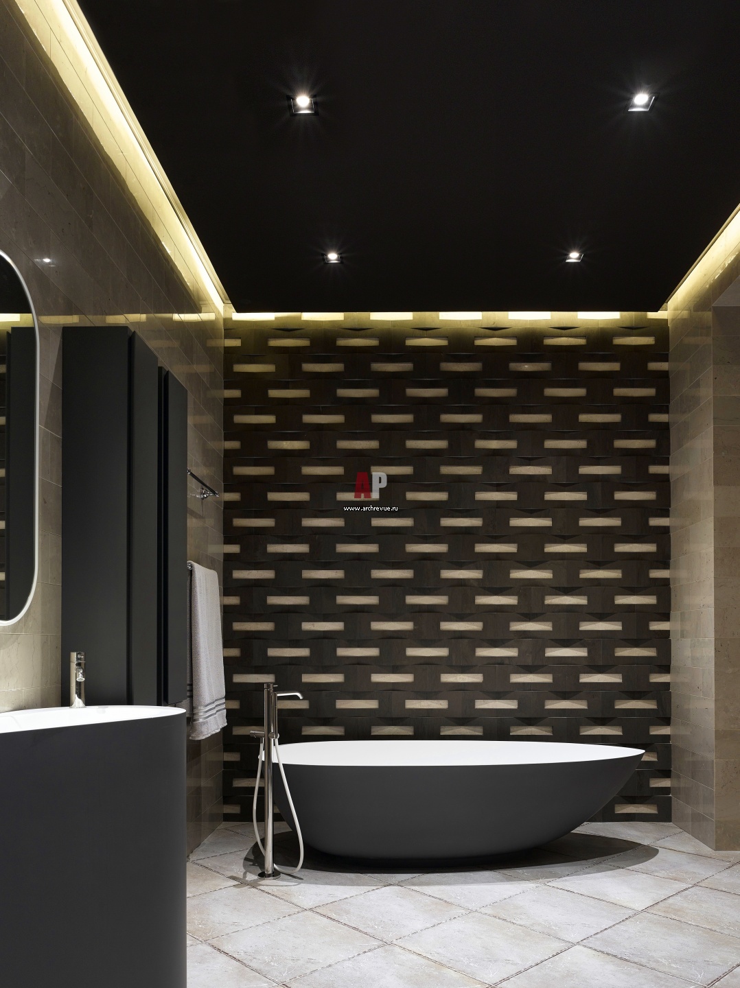 Хозяйская ванная комната оформлена в природных оттенках камня Petra Antiqua. Рельефное панно из камня от пола до потолка украшает всю фронтальную стену помещения. Черная отдельно стоящая ванна, Rexa Design.