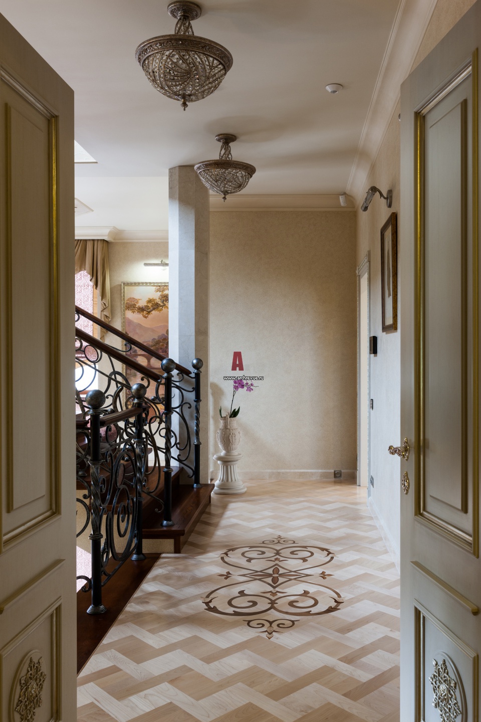 Холл второго этажа в стиле неоклассика.