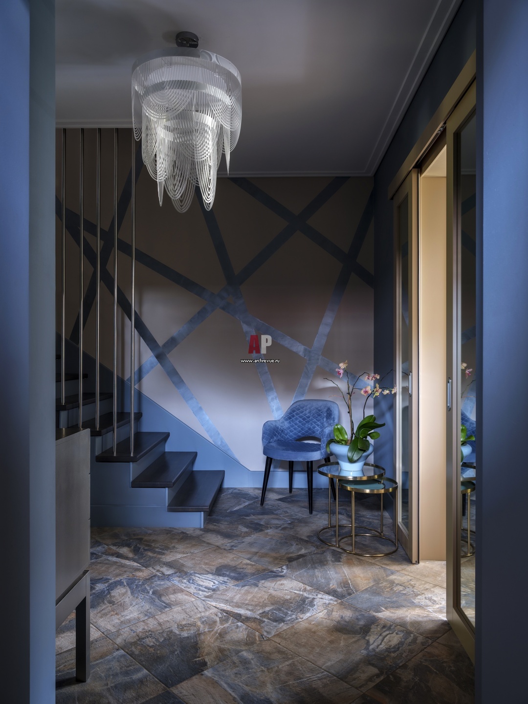 Интерьер прихожей с лестницей в синей палитре. Люстра, Slamp, модель Ceremony Chandelier. Лестница выполнена из дерева, ограждение в виде тонких тросов – металлическое.
