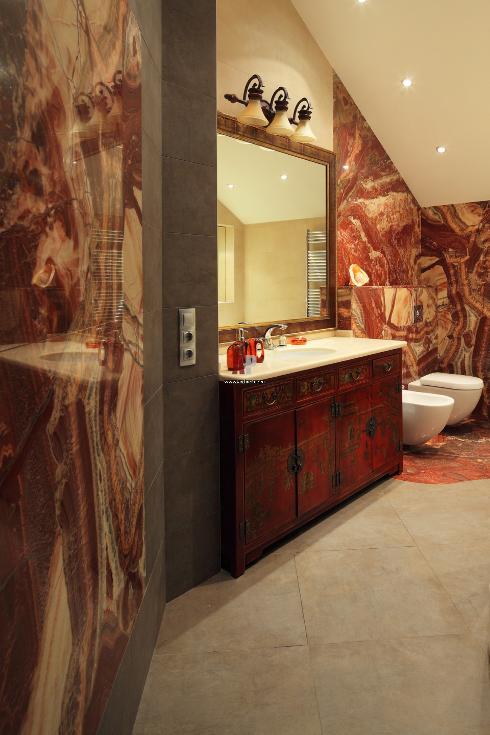 Хозяйский санузел. На стенах – слэбы из оникса Rosso Vaticamo .
