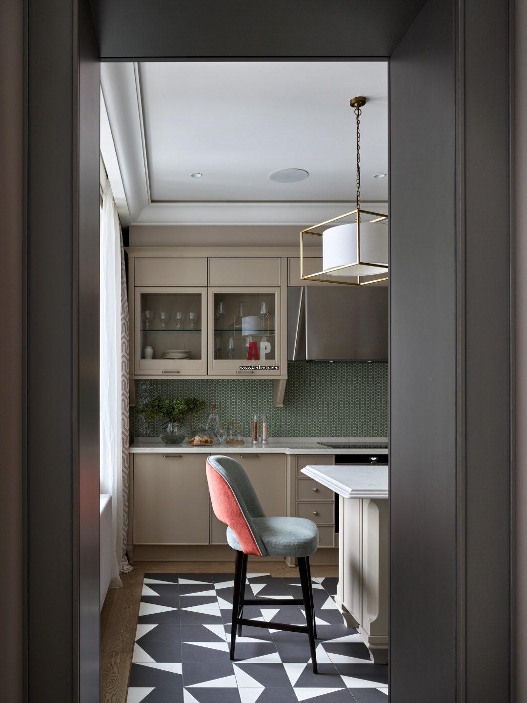 Кухня соединена с гостиной двумя большими открытыми проемами. На полу – плитка с активной геометрией, Mutina, коллекция Puzzle by Barber & Osgerby. Кухонный фартук отделан мозаикой мятного оттенка.