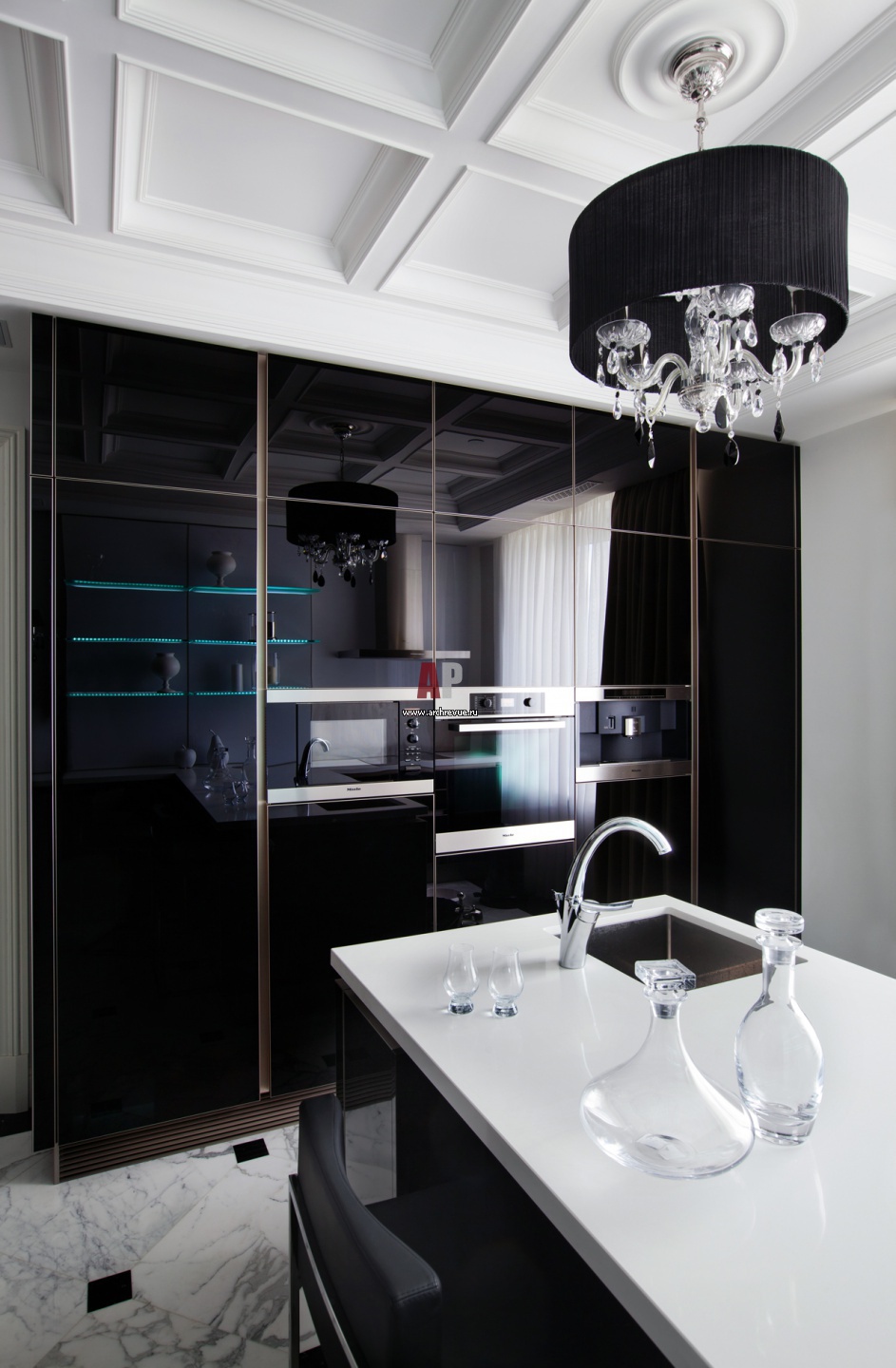 Кухня в современном стиле. Лаконичный мебельный гарнитур EWE (модель Intuo) исполнен в черном лаке. Кессоны на потолке – лепной декор из гипса.