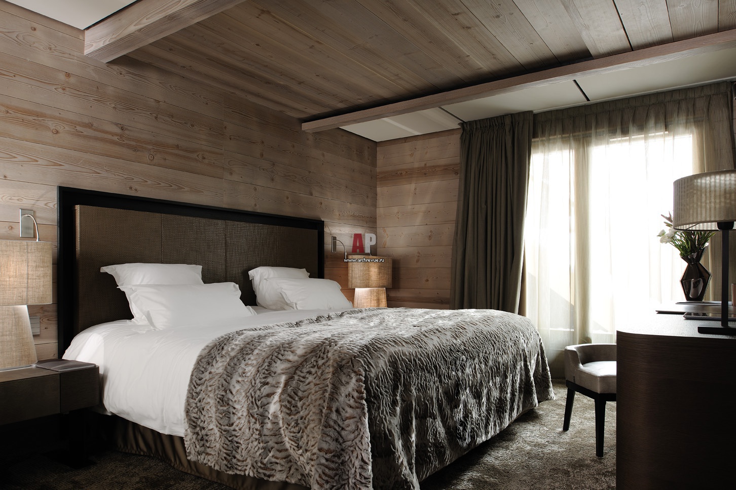 Фото интерьера номера отеля категории luxury в современном стиле. Кровать декорирована меховым пледом.
