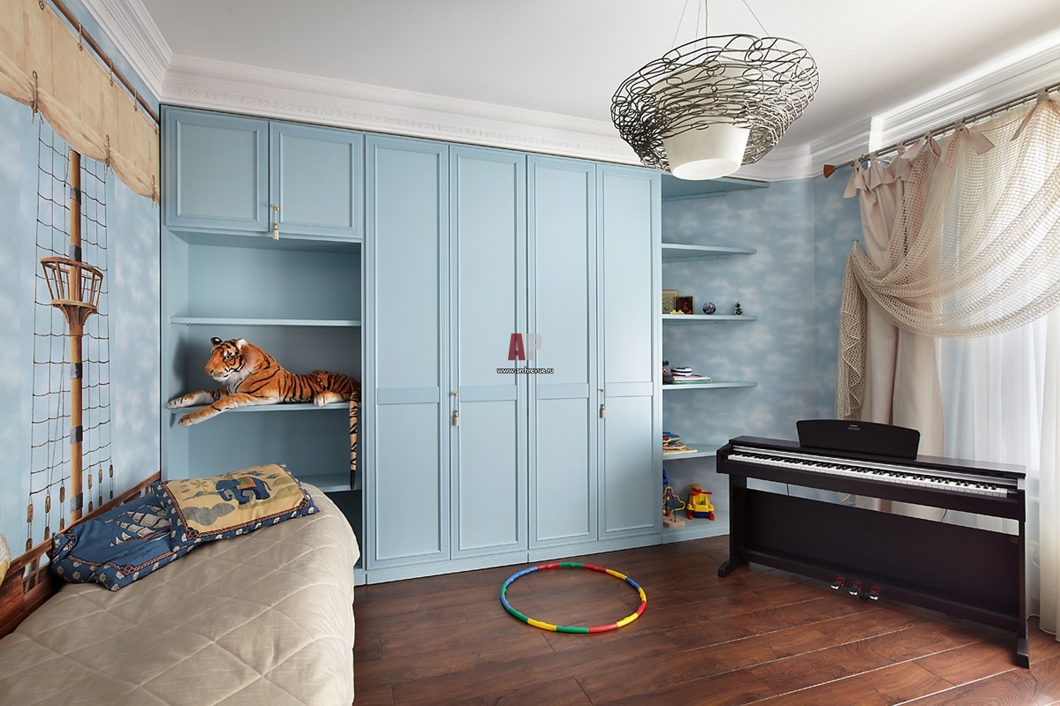 Интерьер детской мальчика исполнен в прохладных голубых тонах.