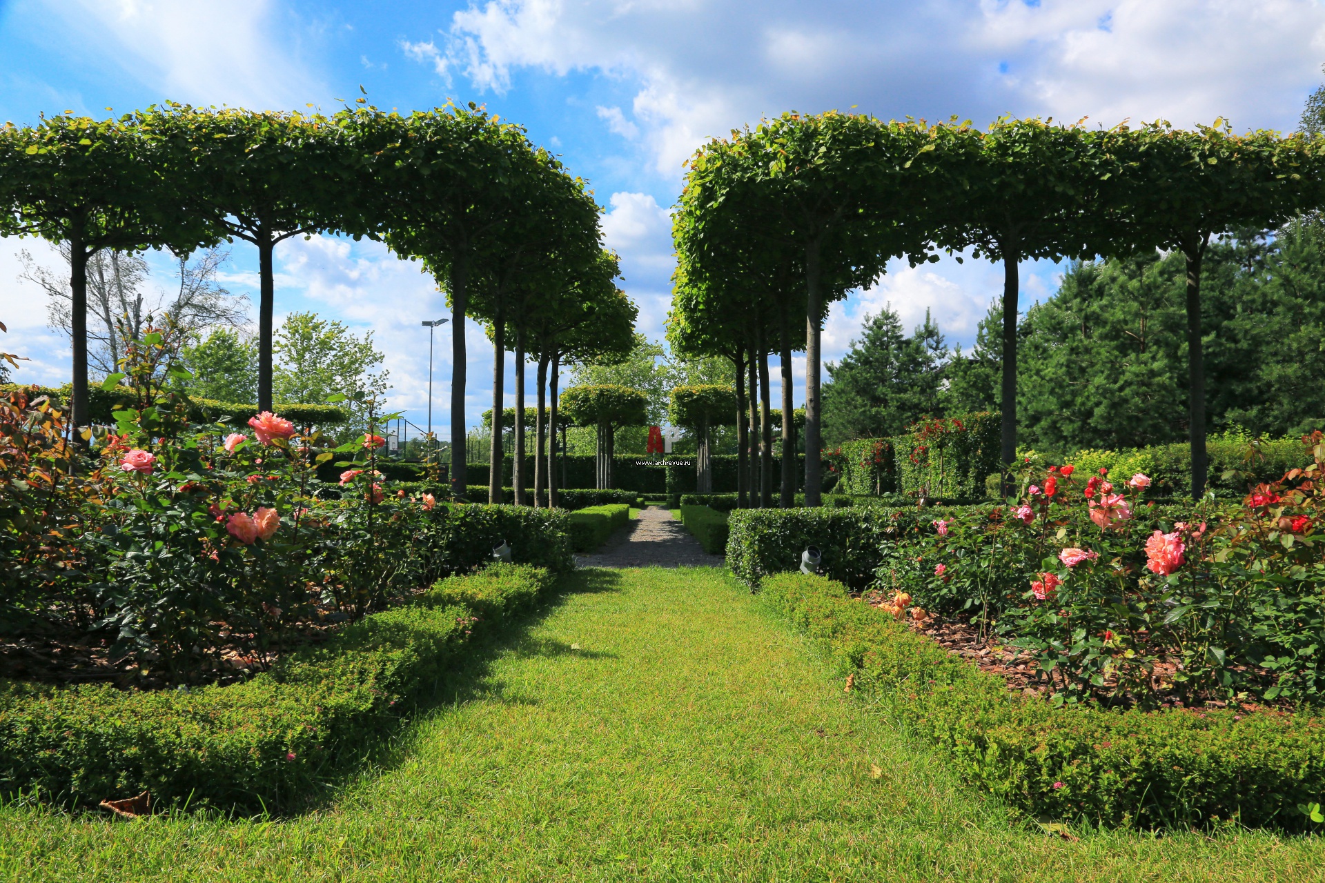 Липы образуют прямоугольный геометрический орнамент, которому вторит лаконичная композиция партеров: прямоугольные цветники и крестообразные дорожки.