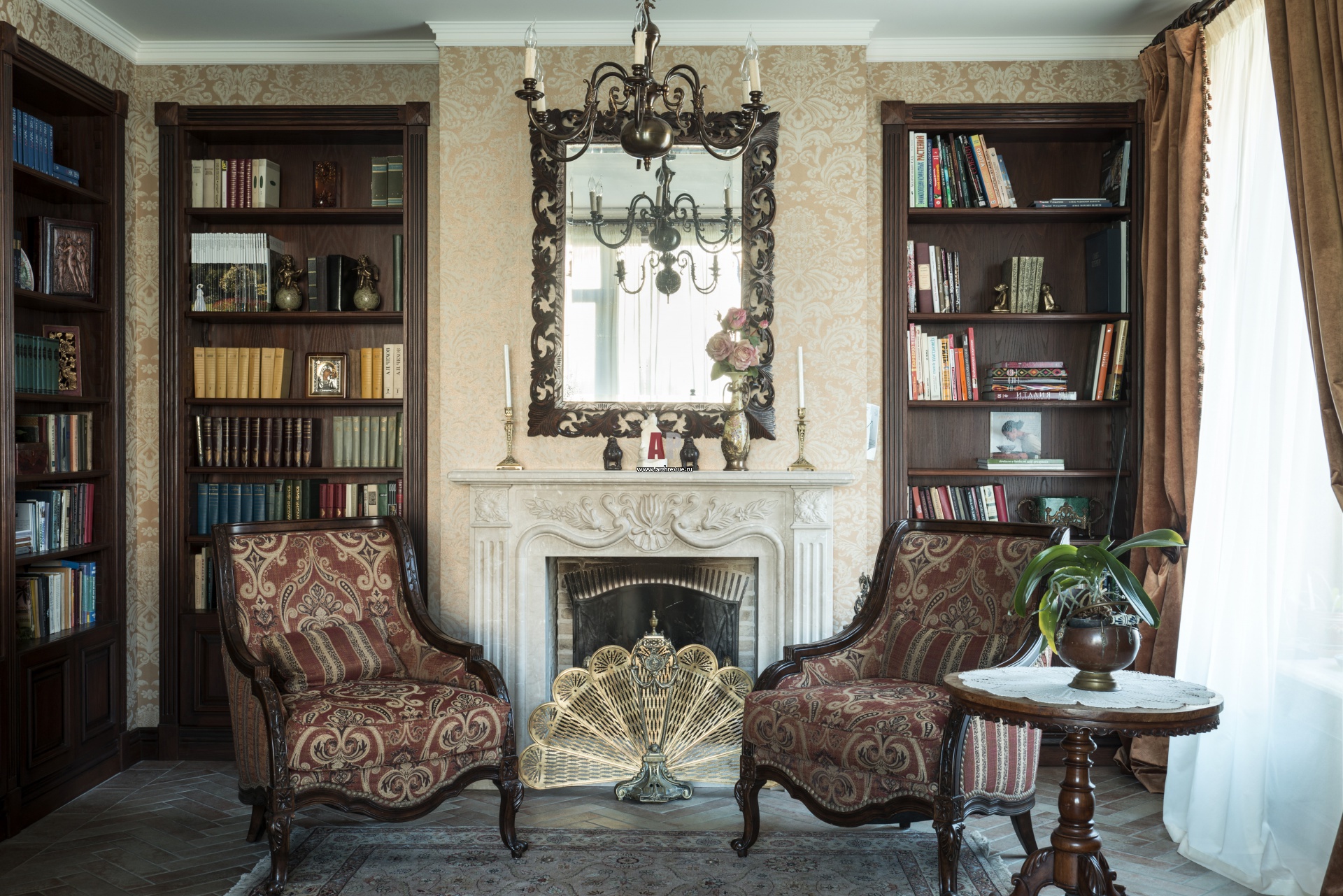 Каменный камин с резьбой изготовлен по эскизам дизайнера Юлии Маркос. Картины, вазы, серебряные подсвечники и раритетный бронзовый экран у камина в виде павлина дизайнер привезла из Франции.