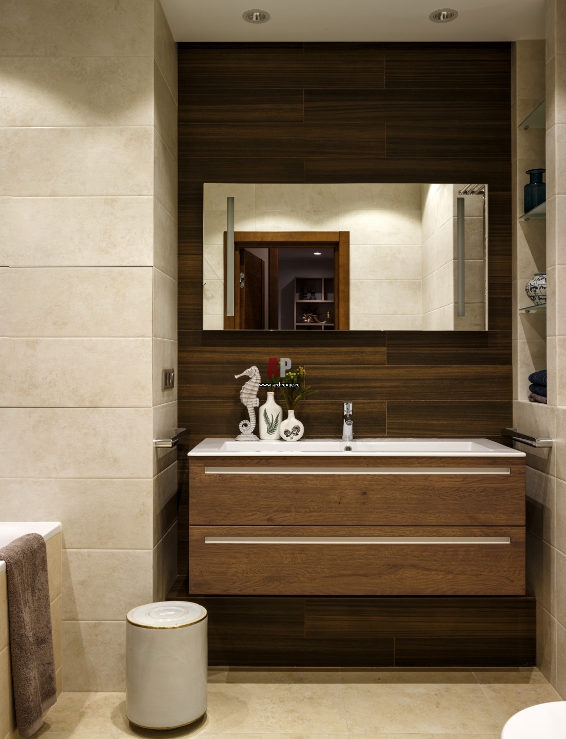 Интерьер санузла в современном стиле. На стенах полу – плитка Gardenia Orchidea, серия Canova, а также керамогранит с текстурой дерева Atlas Concorde, серия Etic Pro. Тумба с раковиной, Arbi. Сантехника, зеркало, Laufen.