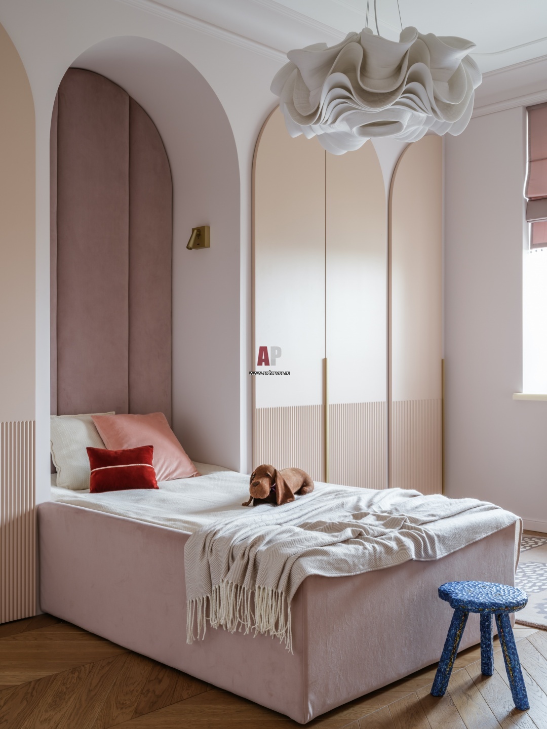 Детские комнаты для двух девочек спроектированы в нежных оттенках. Они имеют много места для хранения, письменные столы для занятий и кровати с изголовьем в нише для создания ощущения защищенности и комфорта. Подвесной светильник Ong Cen Kuang сделан из текстильных молний для одежды и привезен с Бали.