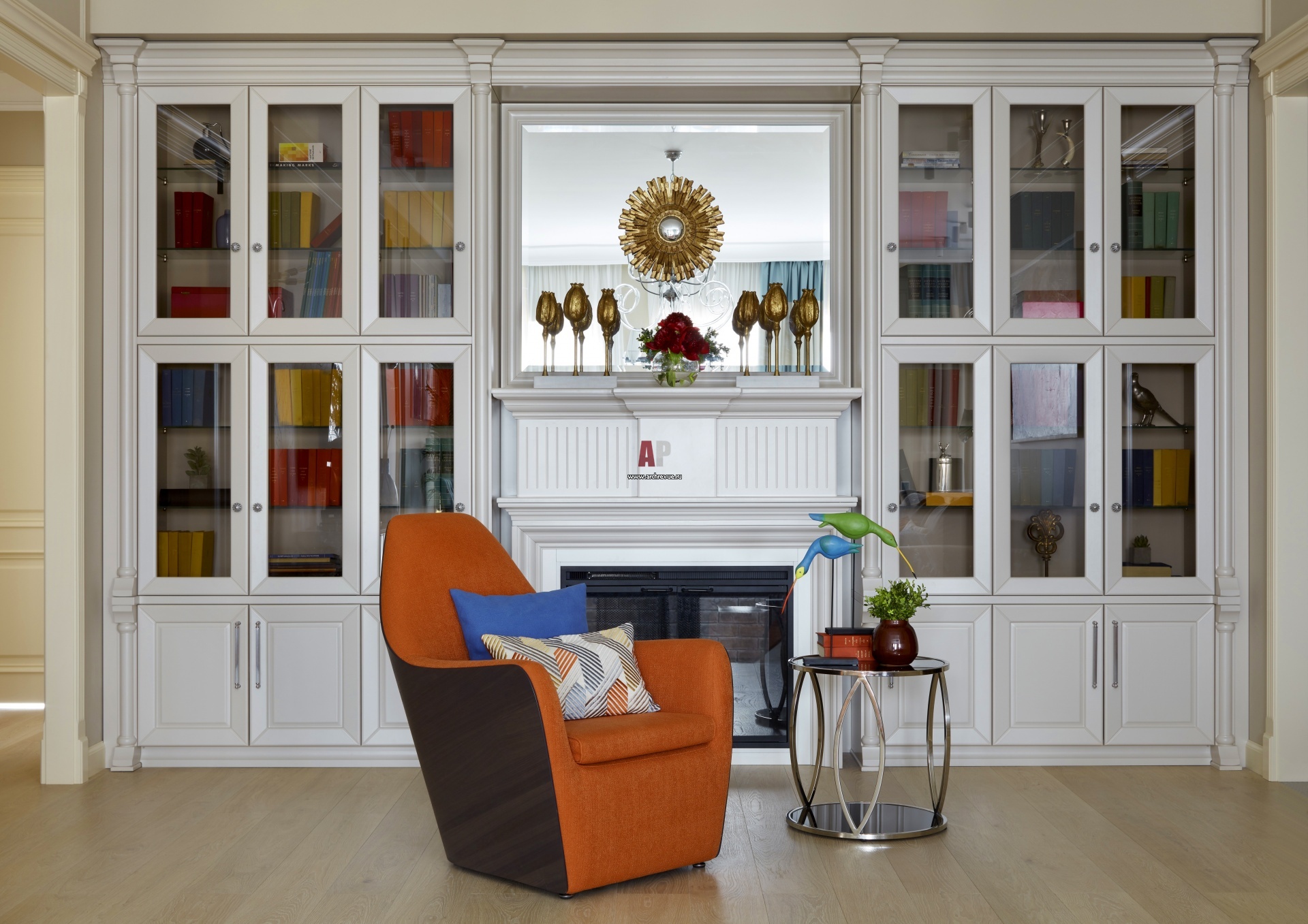 Зона камина в гостиной. Электрический камин с функцией увлажнения воздуха оформлен порталом из дерева и встроен в общую композицию с книжными шкафами. Библиотека Hanak сделана в том же стиле и дизайне что и кухня.