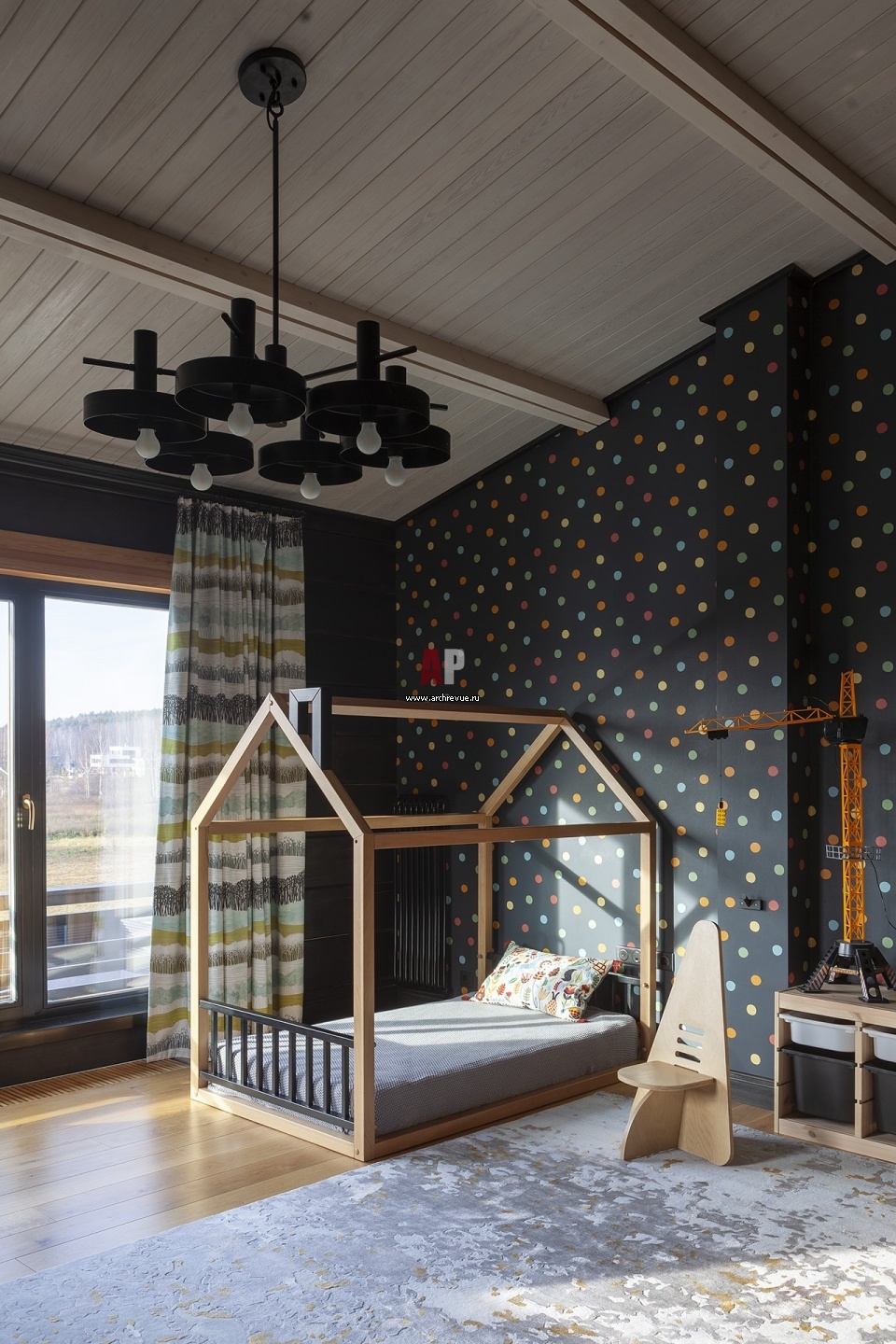 В большой детской выделено несколько зон: для сна, для занятия спортом, для обучения и для игр. Кровать-домик, Doodywoodydom. Детский стульчик, винтаж.