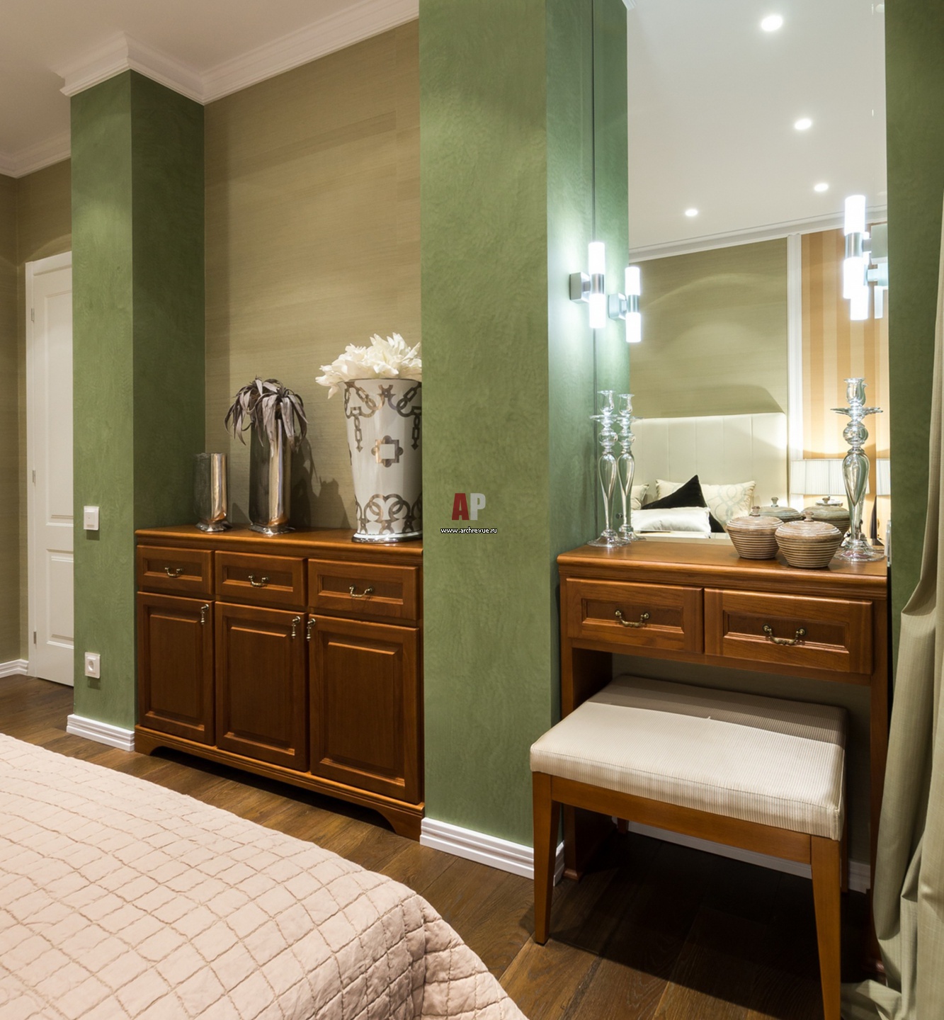 Стена напротив кровати с конструктивными пилонами оформлена декоративной штукатуркой нежного серо-зеленого цвета и текстильными обоями. Туалетный столик и комоды встроены в существующие ниши.
