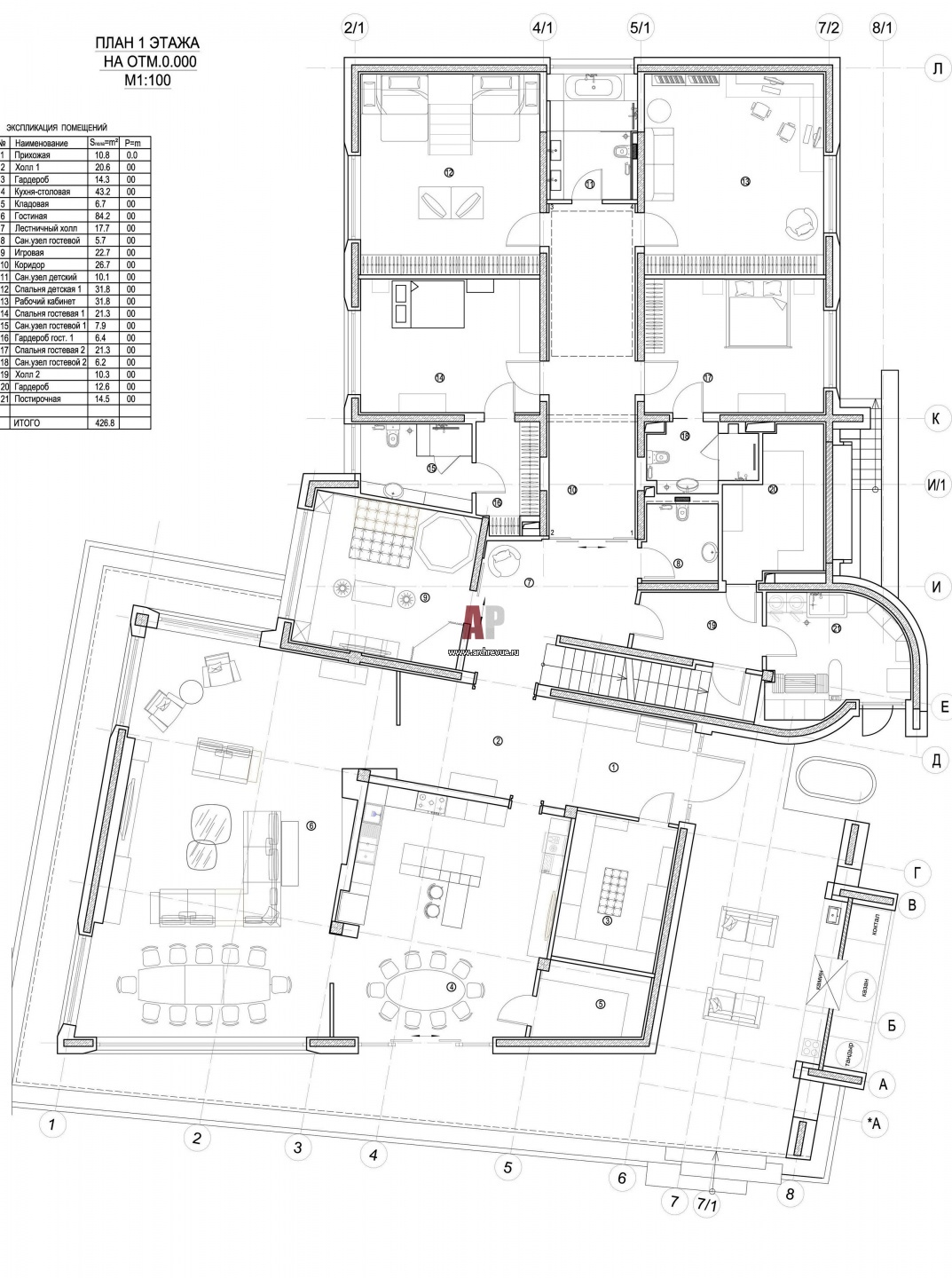 План первого этажа двухэтажного дома со сложной геометрией и наклонными потолками. Общая площадь: 520 кв. м.