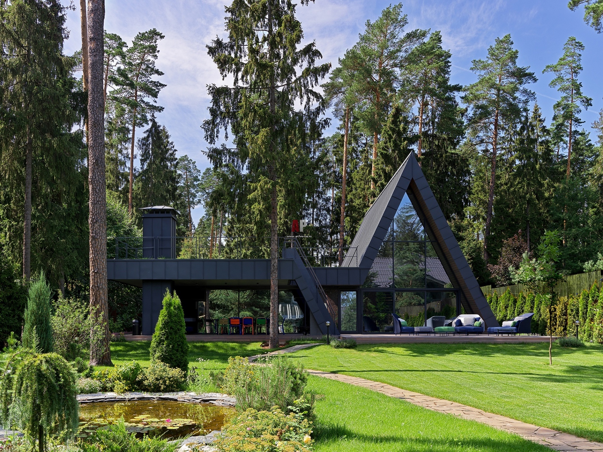 Гостевой дом имеет треугольную форму. К стеклянному объему со скатной кровлей пристроен бетонный блок с эксплуатируемой кровлей – большой гараж.