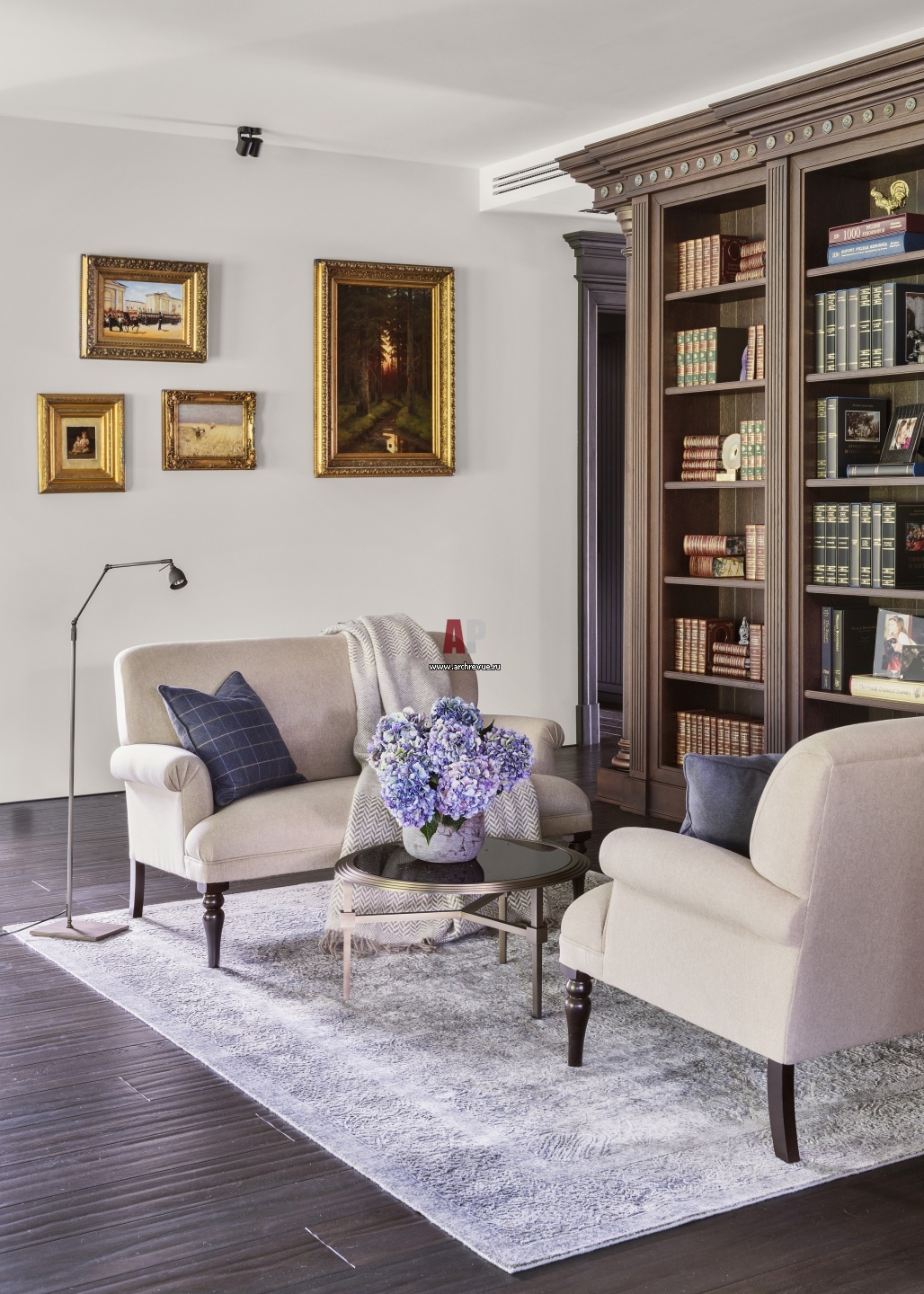 Фламандская усадьба в Подмосковье. Интерьер библиотеки. Вдохновением послужила уникальная семейная коллекция произведений искусства – живописные полотна XVIII-XIX вв. и антикварные книги.