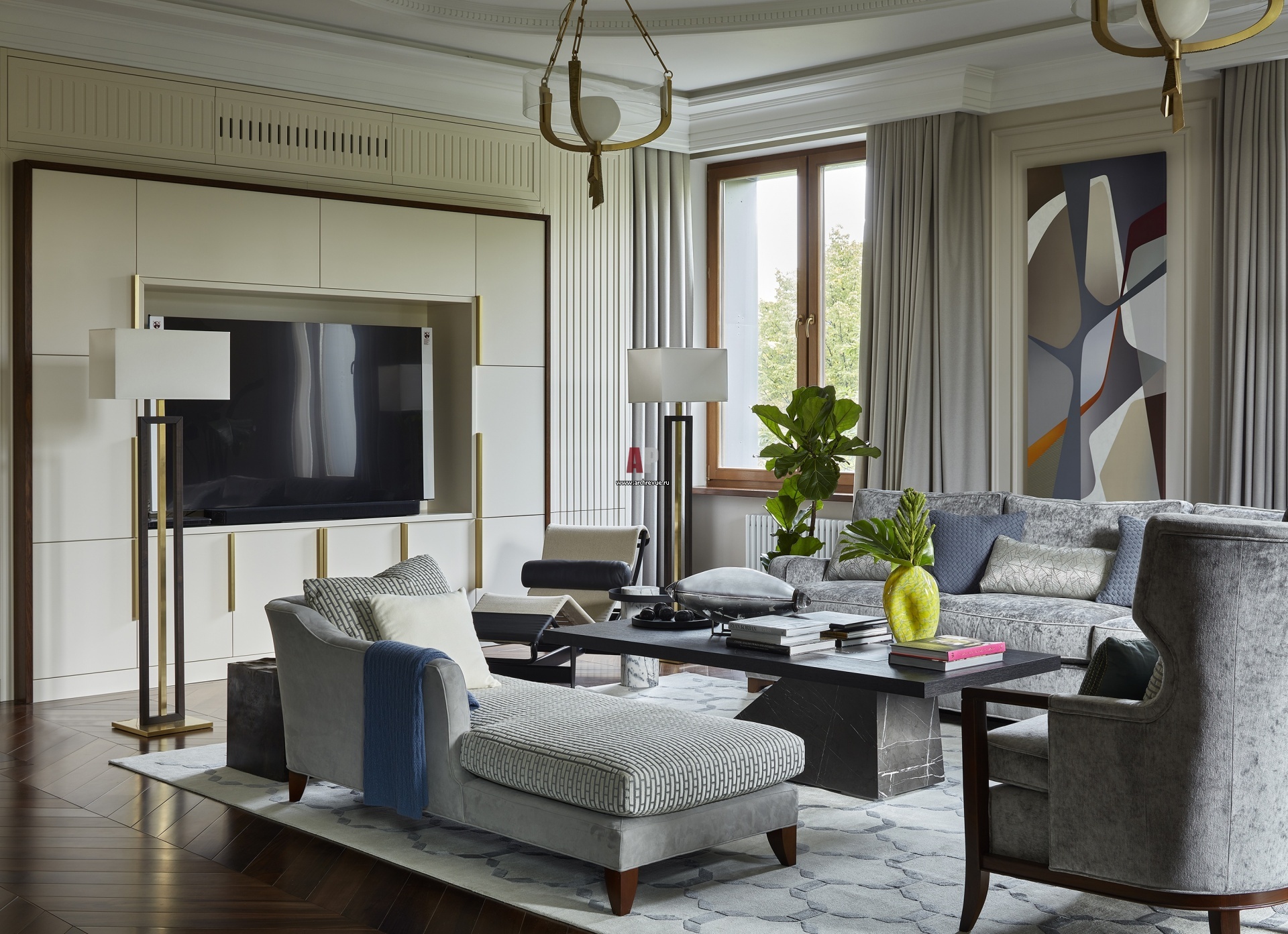 Гостиная. Корпусная ТВ-мебель сделана на заказ. Фриз на корпусной мебели – реверанс в сторону античной пилястры. На полу – итальянский паркет с укладкой «французская елка» из древесины американского ореха с долговечным покрытием. Стены окрашены бархатистой краской, Designers Guild (цвет Cantucci).