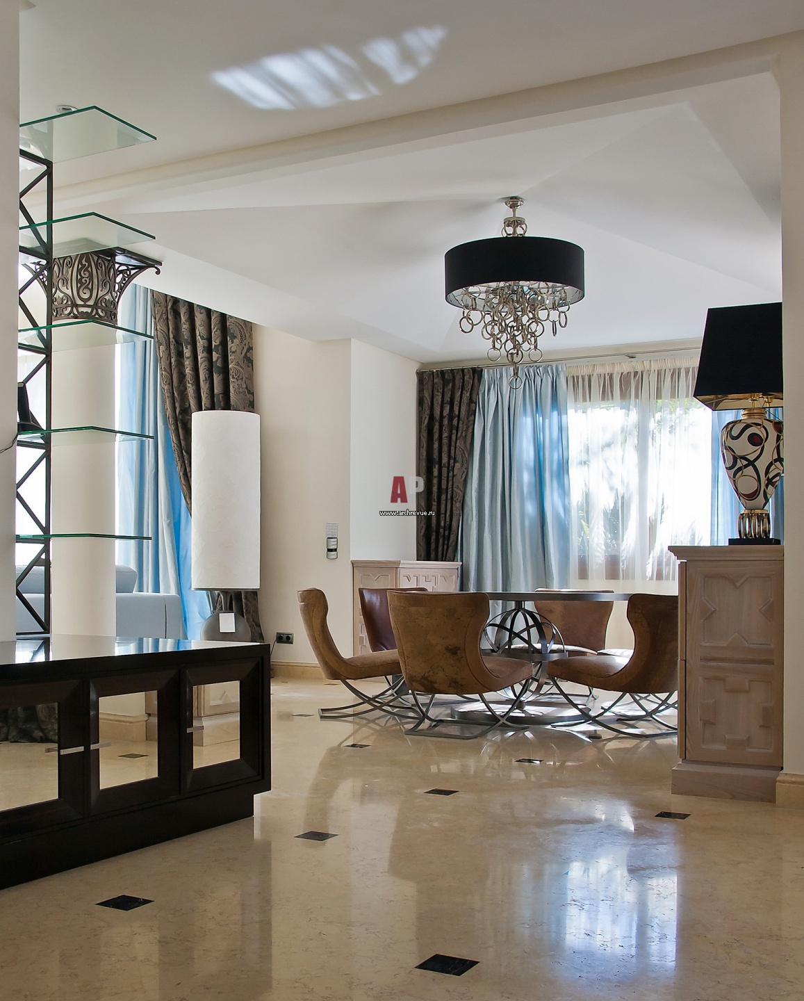 Современный интерьер виллы в Испании. Полы выложены светлым полированным мрамором с коричневыми декоративными вставками. Текстильный дизайн в коричнево-синих тонах.