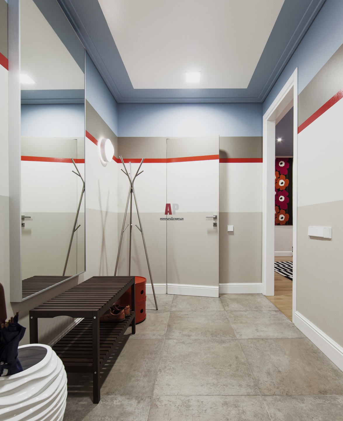 Стены прихожей окрашены контрастными полосами. Тумба, Kartell. Потолочные светильники, Fabbian. Настенные светильники, Linea Light.