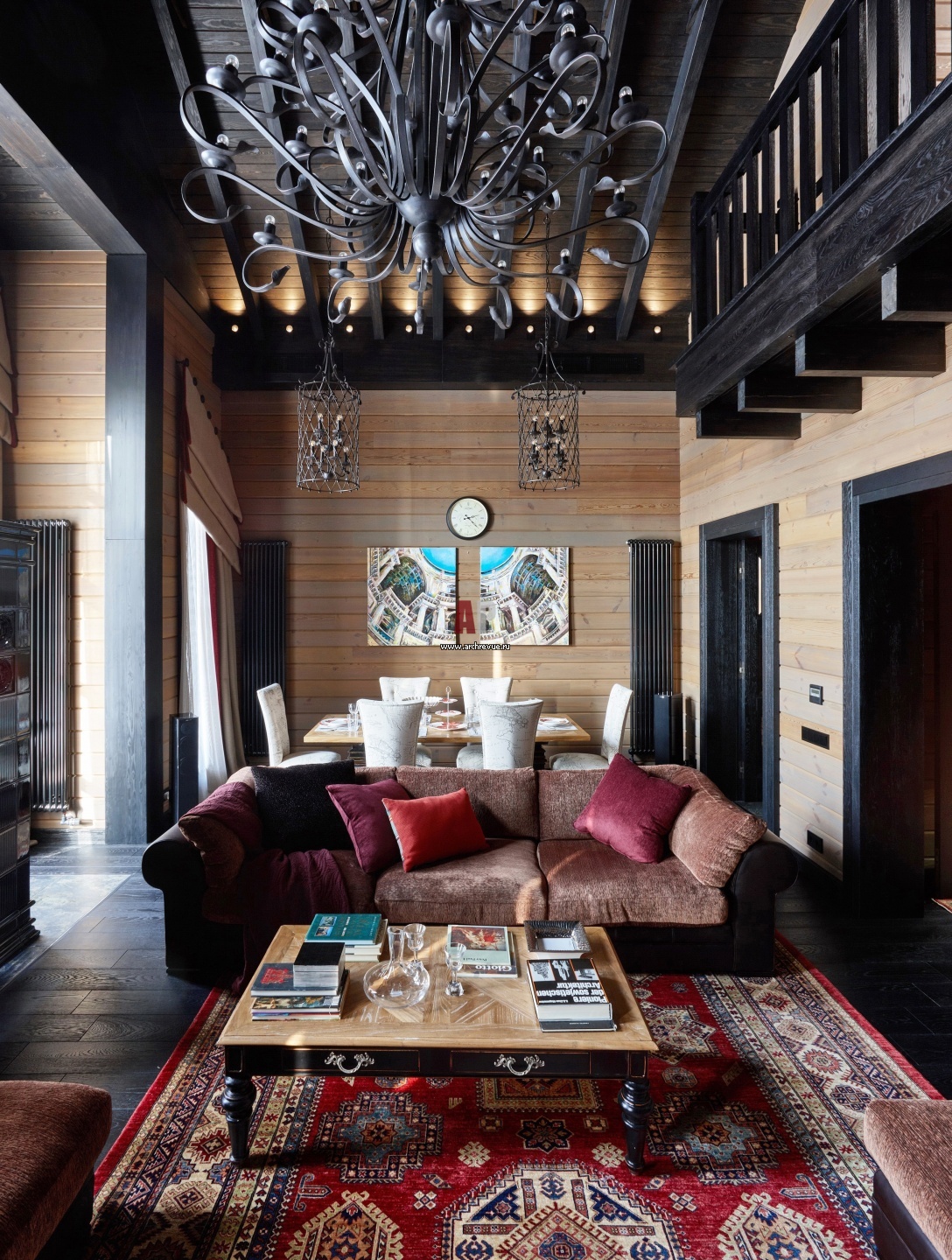 Интерьер гостиной дома в стиле шале. Диван, кушетка, Roche Bobois. Шторы сшиты изо льна.