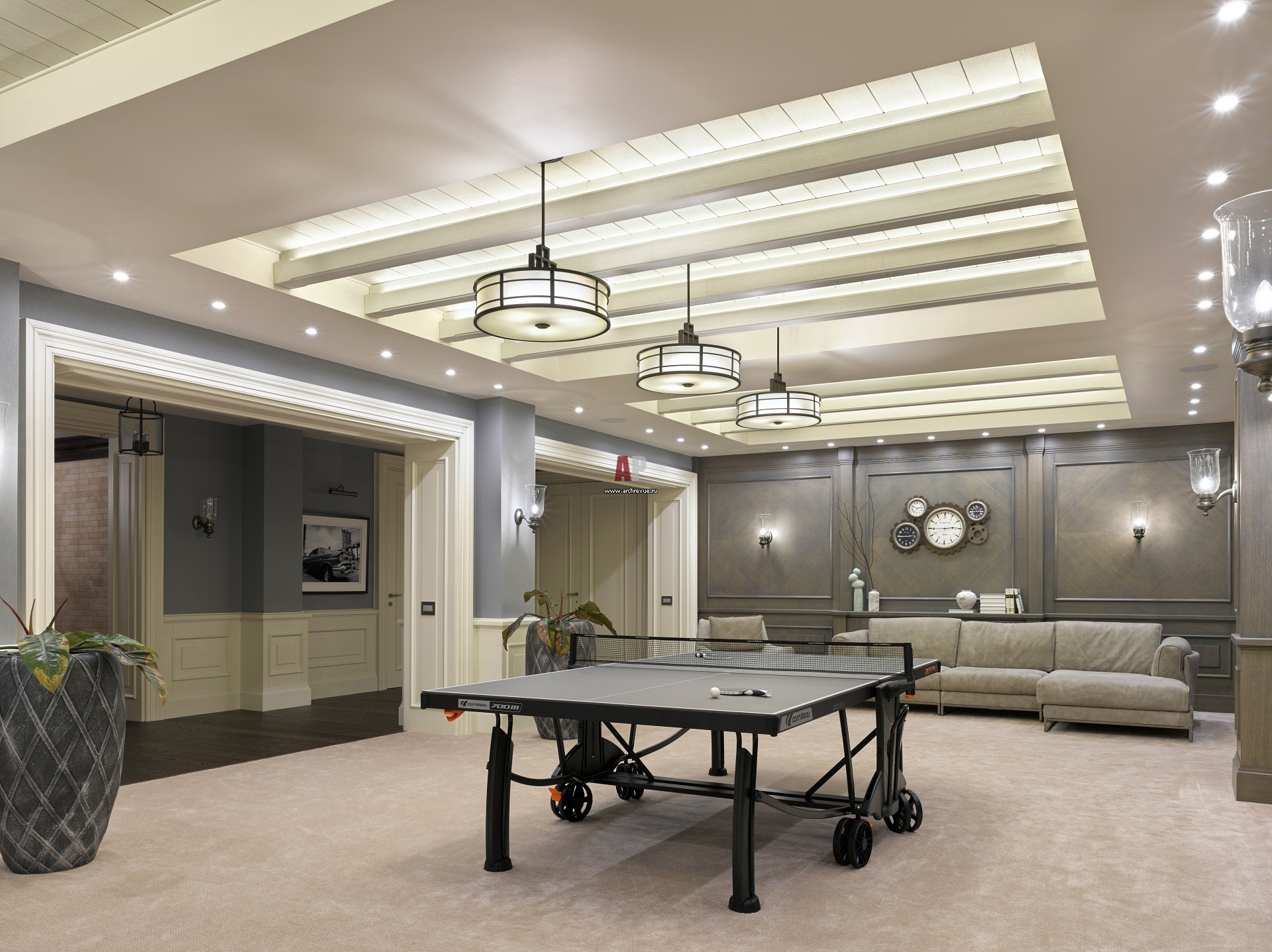 Зал для игры в пинг-понг расположен в цокольном этаже. Потолочная закарнизная подсветка и точечные светильники компенсируют отсутствие в помещении естественного света. Стены зашиты деревянными панелями дымчато-серого цвета.