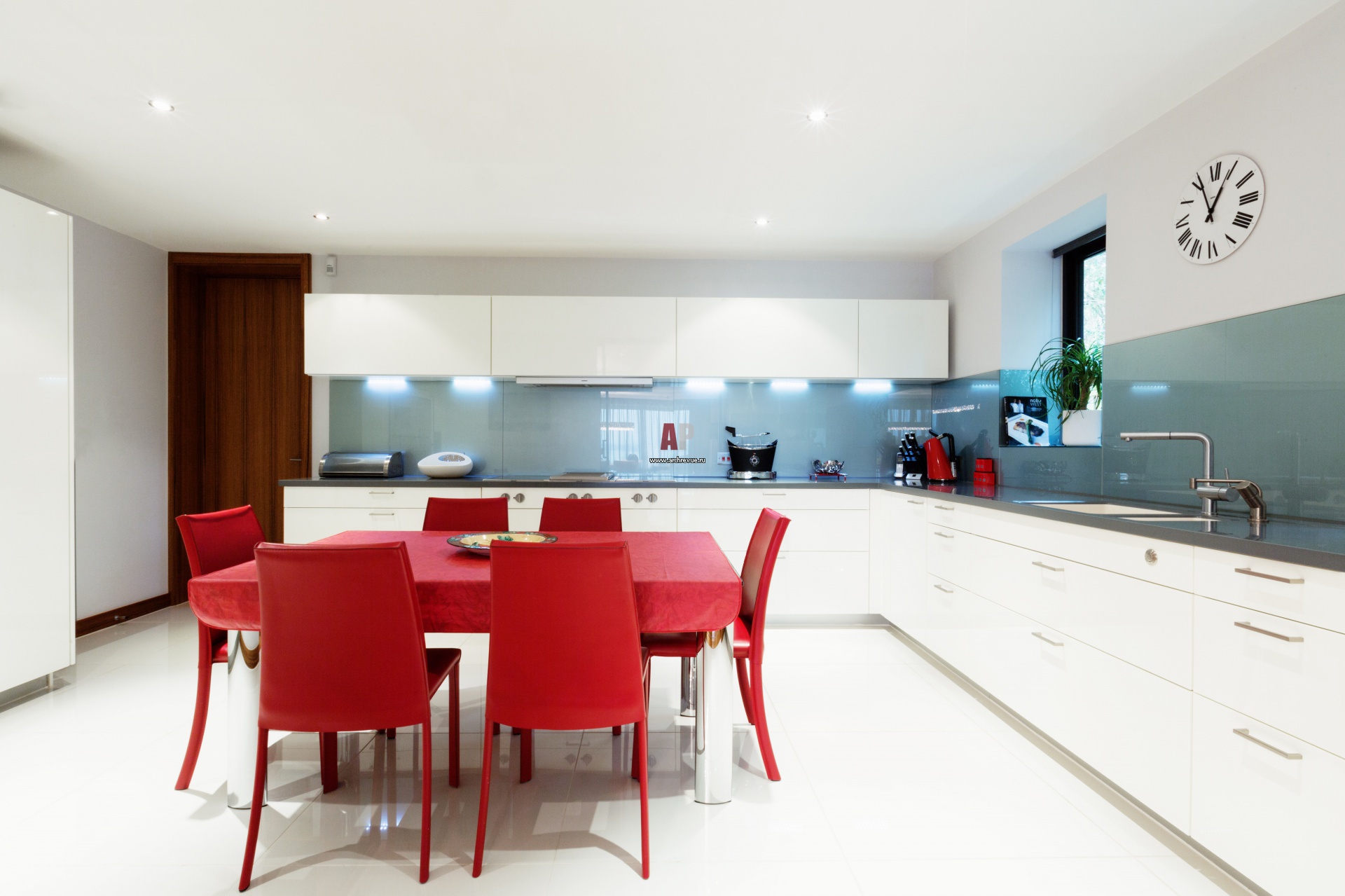 Кухня выполнена в минимализме. Лаконичный белый кухонный гарнитур контрастирует с красной обеденной группой. Кухонный фартук из стекла, столешница из серого искусственного камня.