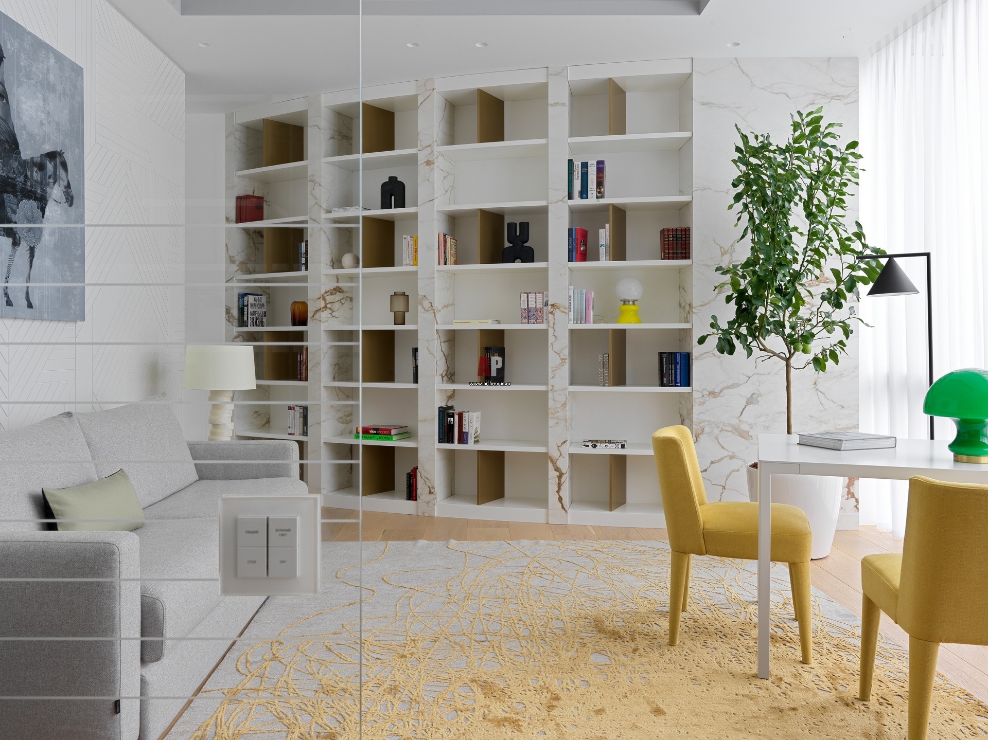 Чтобы замаскировать радиусную стену в библиотеке (за ней находится общий лестничный холл), дизайнер придумала интересный стеллаж, который повторяет ее форму. Пилоны облицованы керамогранитом под мрамор, полки деревянные – изготовление, «АФ Ника». Диван, DiTre Italia.