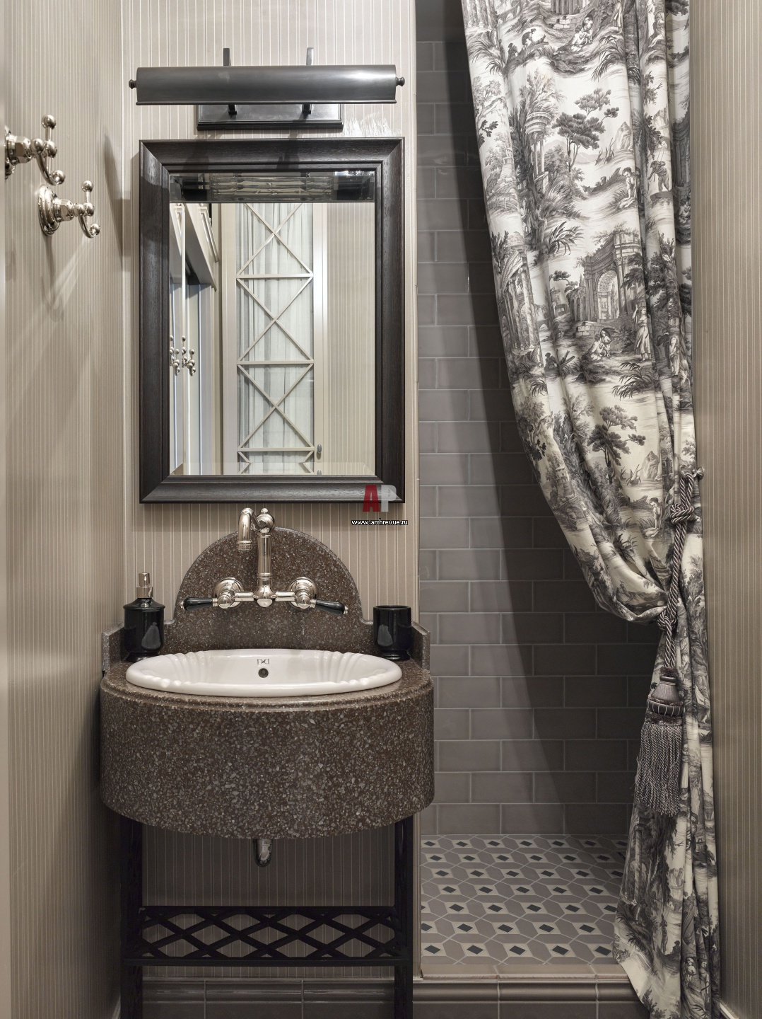 Фото интерьера гостевого санузла площадью 3,8 кв. м с круглой раковиной и небольшой душевой. Напольная плитка, TopCer. Настенная плитка, Ceramiche Grazia. Раковина Devon & Devon встроена в столешницу из искусственного камня по индивидуальному заказу. Смесители в английском стиле, Nicolazzi.