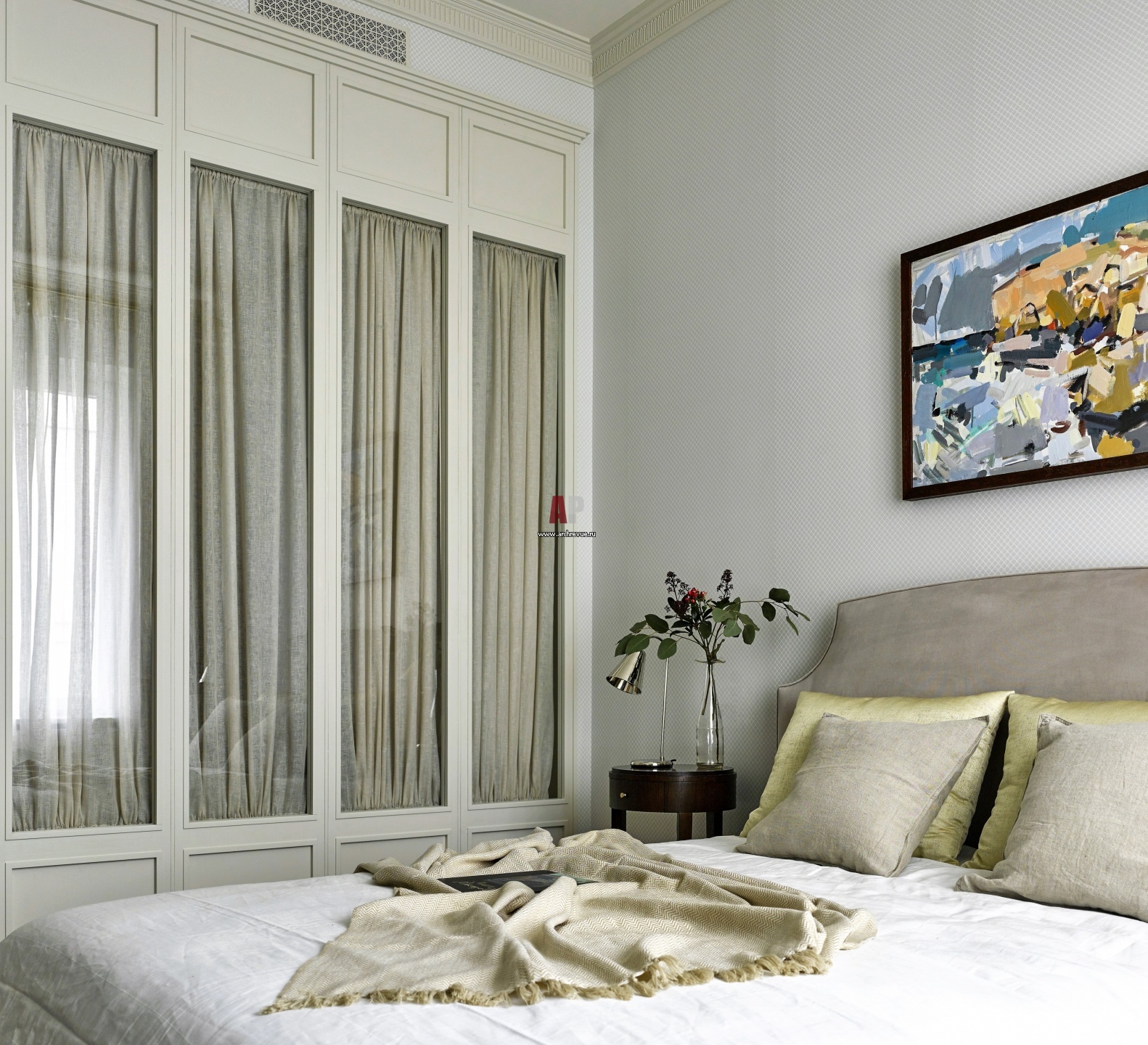 Спальня в светлых тонах. Встроенный в нишу гардеробный шкаф со стеклянными дверцами сделан на заказ. Изнутри дверцы декорированы шторами.