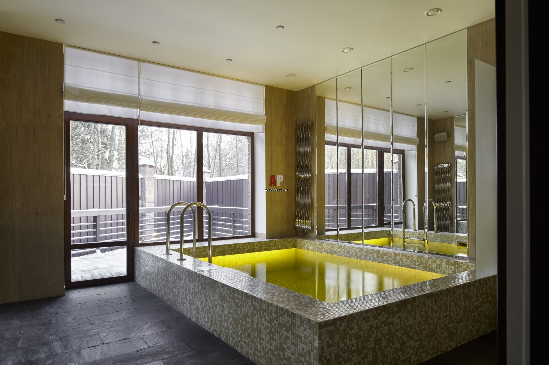 Купель в СПА-зоне. Панорамные окна позволяют интерьеру слиться с природой. Оконые рамы отделаны шпоном венге.