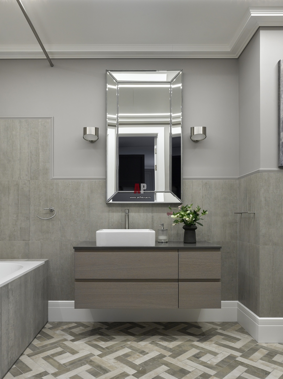 Ванная комната сына выполнена в современной стилистке. Сантехника, Duravit. Раковина и подвесная тумба, Arbi. Бра, Estiluz. Стены и пол облицованы керамогранитом Provenza и Emilceramica.