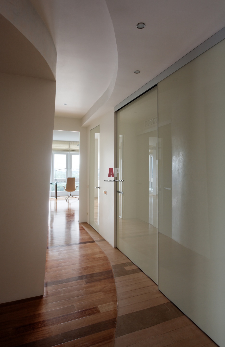 Гардеробная с раздвижными дверями с глянцевой поверхностью при входе в квартиру.
