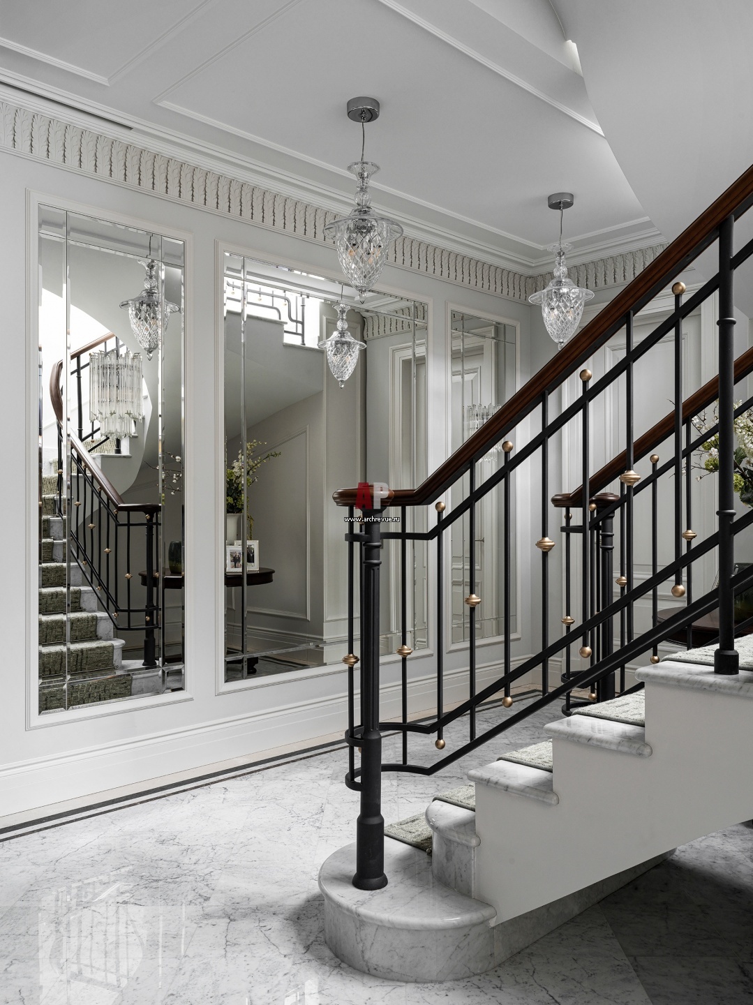 Зеркальные встроенные шкафы в парадном холле зрительно увеличивают пространство. Потолочные светильники, Italamp.