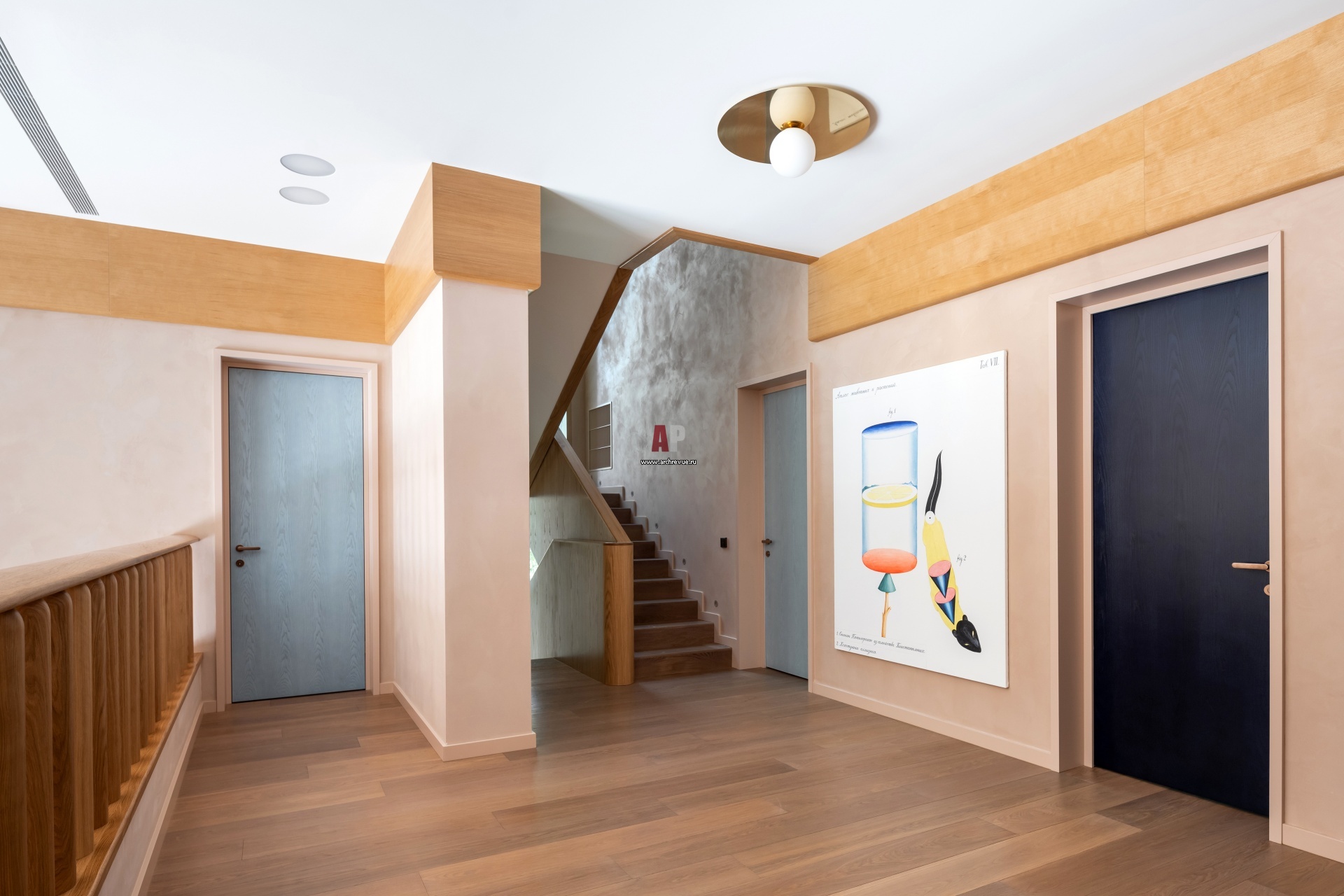 Холл второго этажа с лестницей на третий этаж. Ограждение балкона выполнено по эскизам авторов проекта. Массивный дубовый карниз связывает интерьер в единую композицию. На стене работа Виктора Пивоварова.