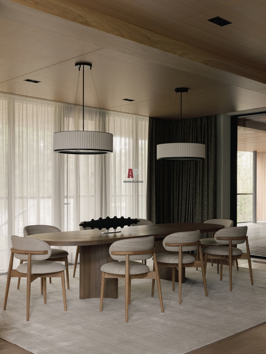 Столовая группа оформлена в природном стиле. Столешница обеденного стола имеет овальную форму. Сглаженные углы создают уют.
