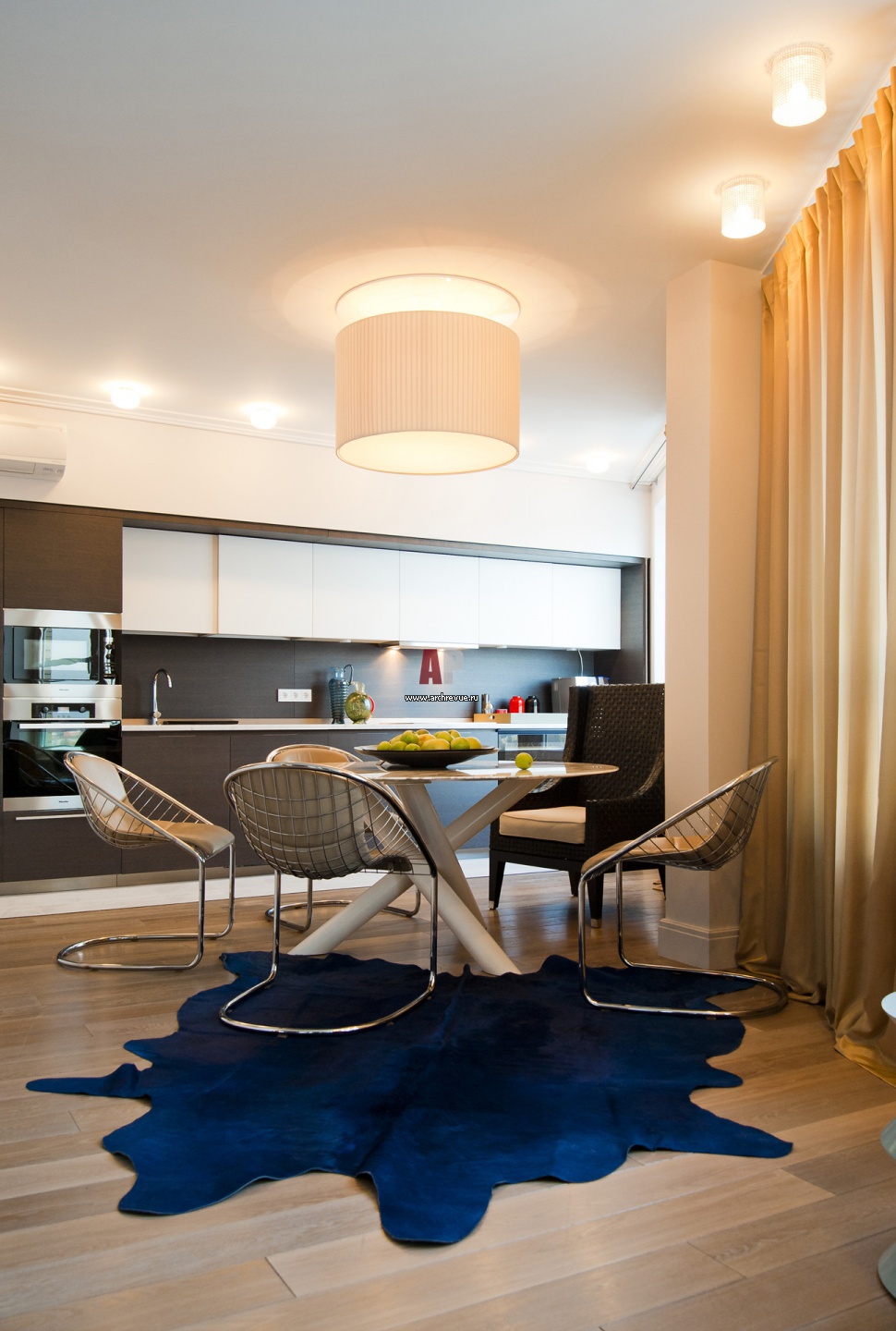 Обеденный стол со скошенными ножками и стеклянной столешницей.