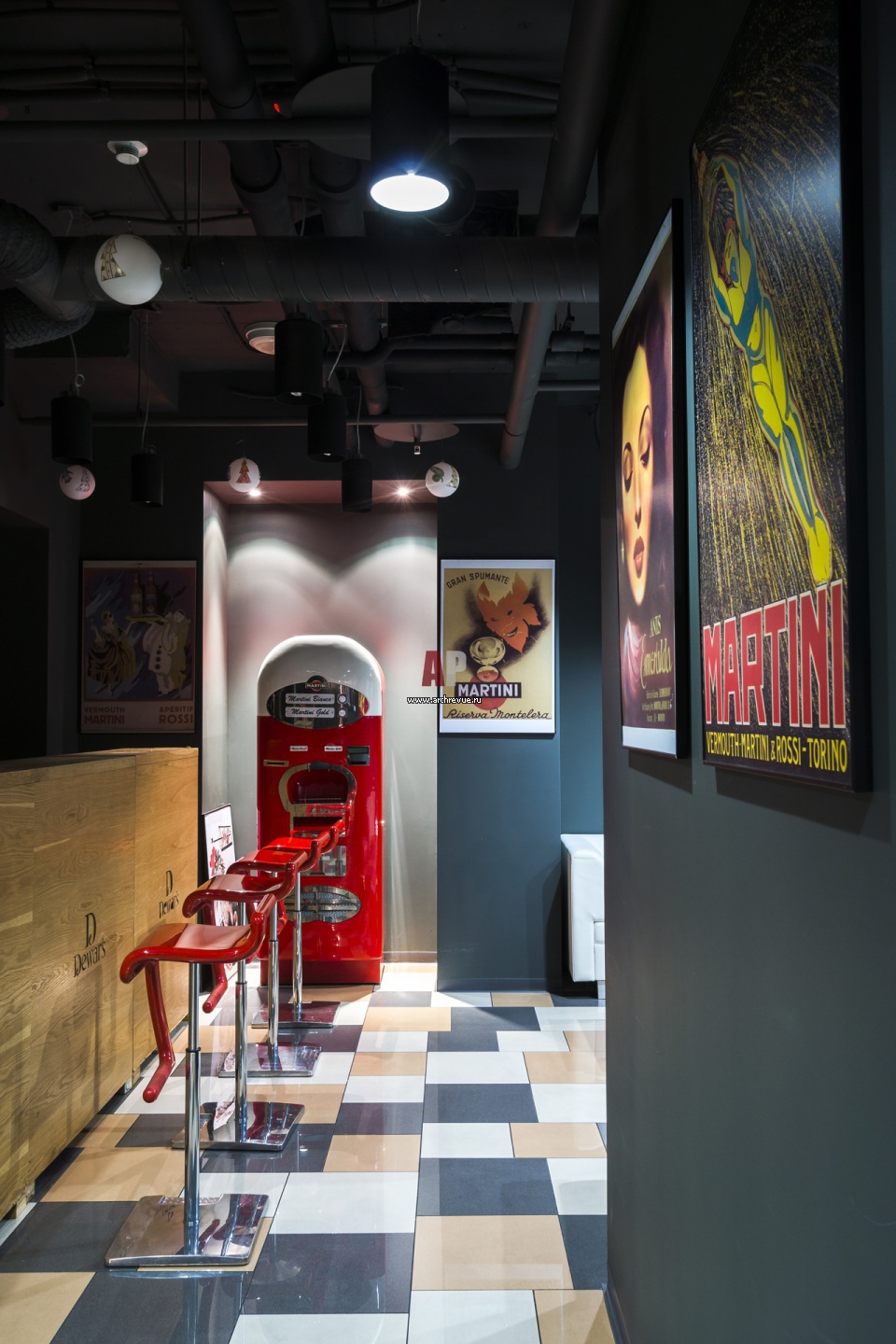 Барная зона – место для презентаций. На полу – панно из глянцевого керамогранита белого, песочного и серо-зеленого цветов. На стене – раритетные плакаты из истории бренда Bacardi. Красные барные стулья.
