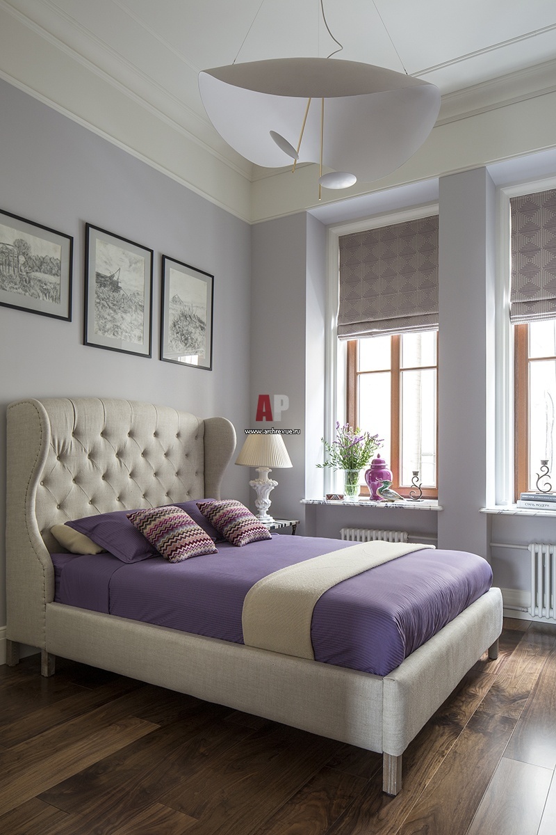 Гостевая спальня выполнена в нежных лавандовых тонах. Высота помещения подчеркнута широким лепным карнизом. Люстра, Catellani & Smith. Кровать, Curation Limited.