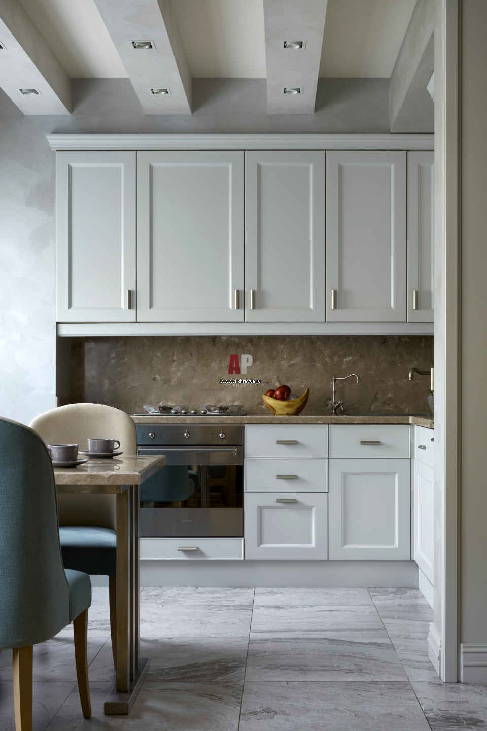 Эклектичная кухня оформлена на стыке классики и современности. Кухонный гарнитур выполнен на заказ по эскизам дизайнера. Столешница, фартук сделаны из кварцита. На полу – серый керамогранит «под мрамор», Rex.