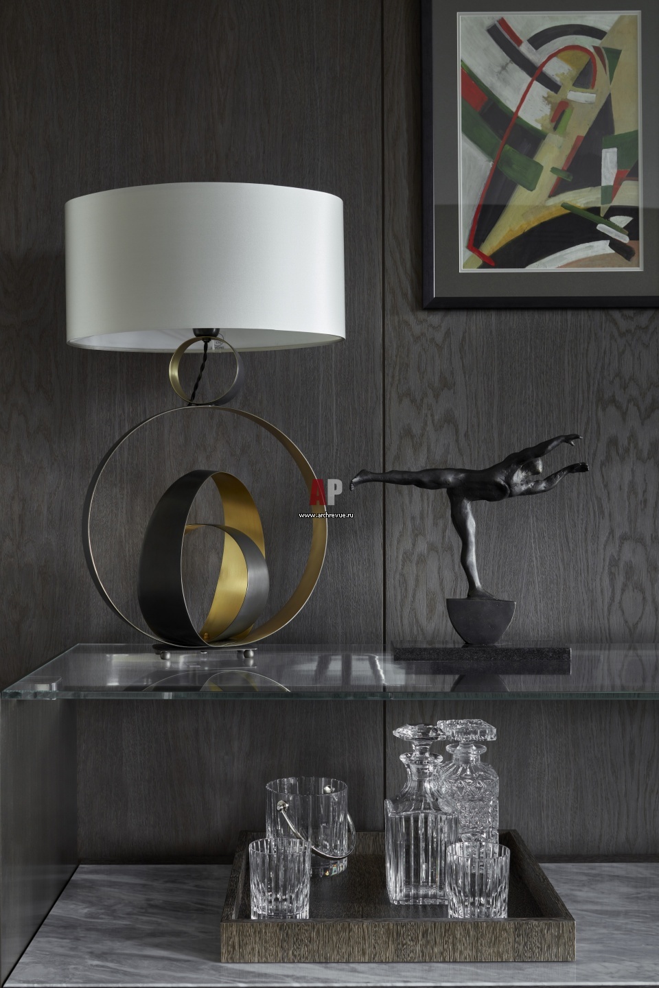 Фрагмент гостиной. Настольные лампы CTO Lighting. Деревянные панели выполнены на заказ.