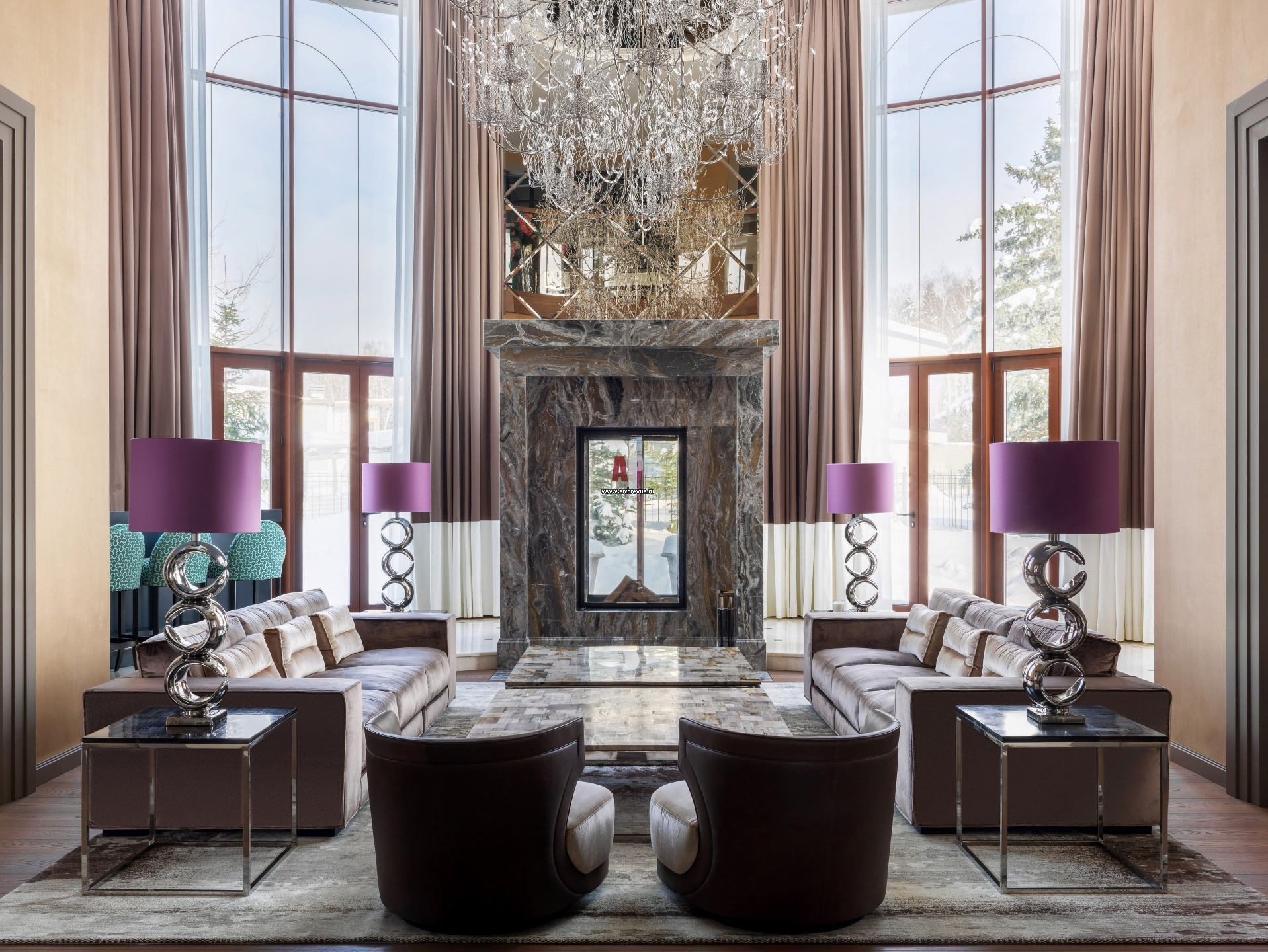 Камин высотой 2,4, его портал облицован камнем с активным рисунком, а дымоход оформлен графитовыми зеркалами. Особенность камина – сквозная топка: сквозь языки пламени прекрасно просматривается природный ландшафт.