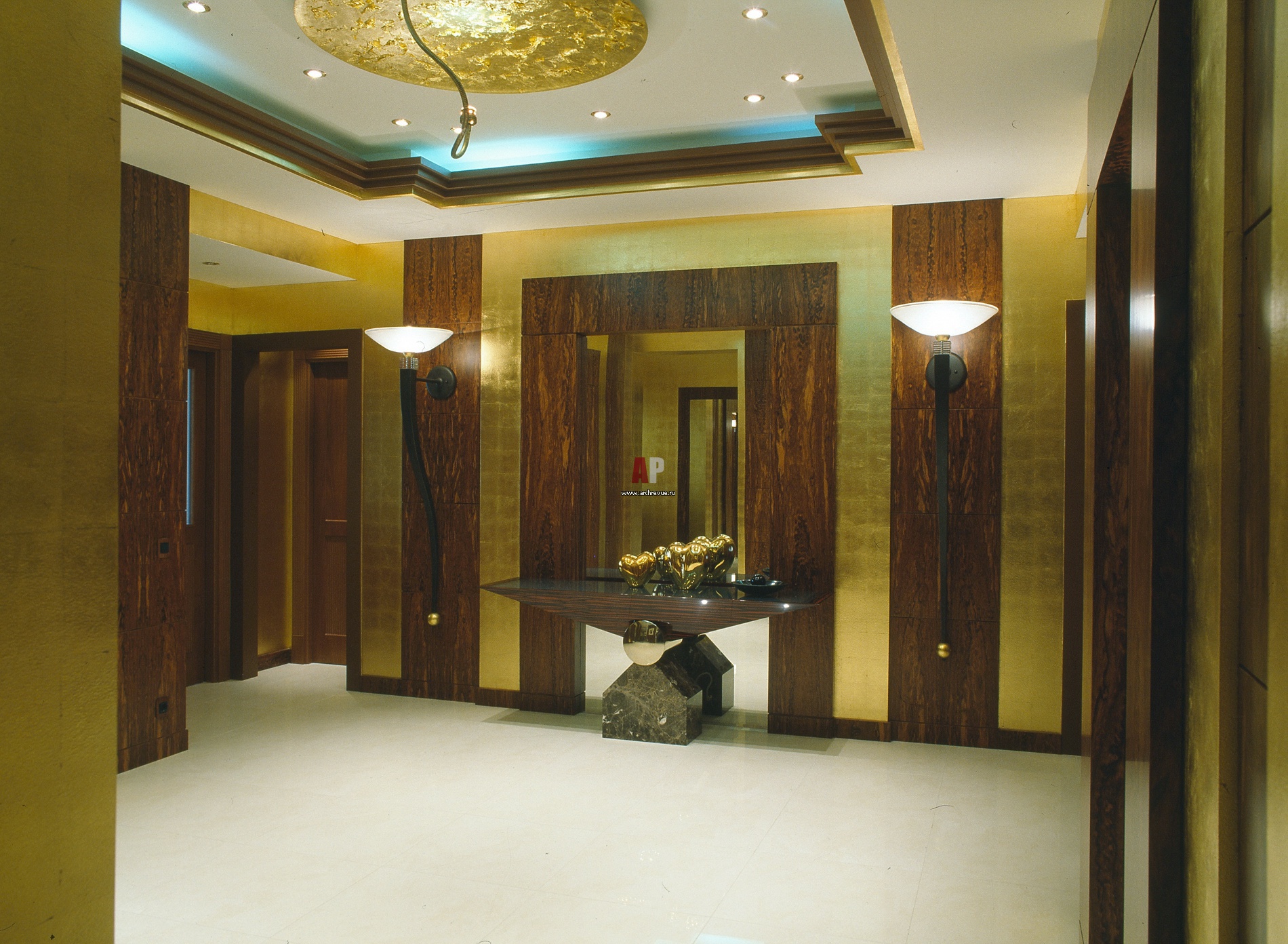 Стены входной зоны облицованы панелями из палисандра. С ними гармонируют отделка сусальным золотом.
