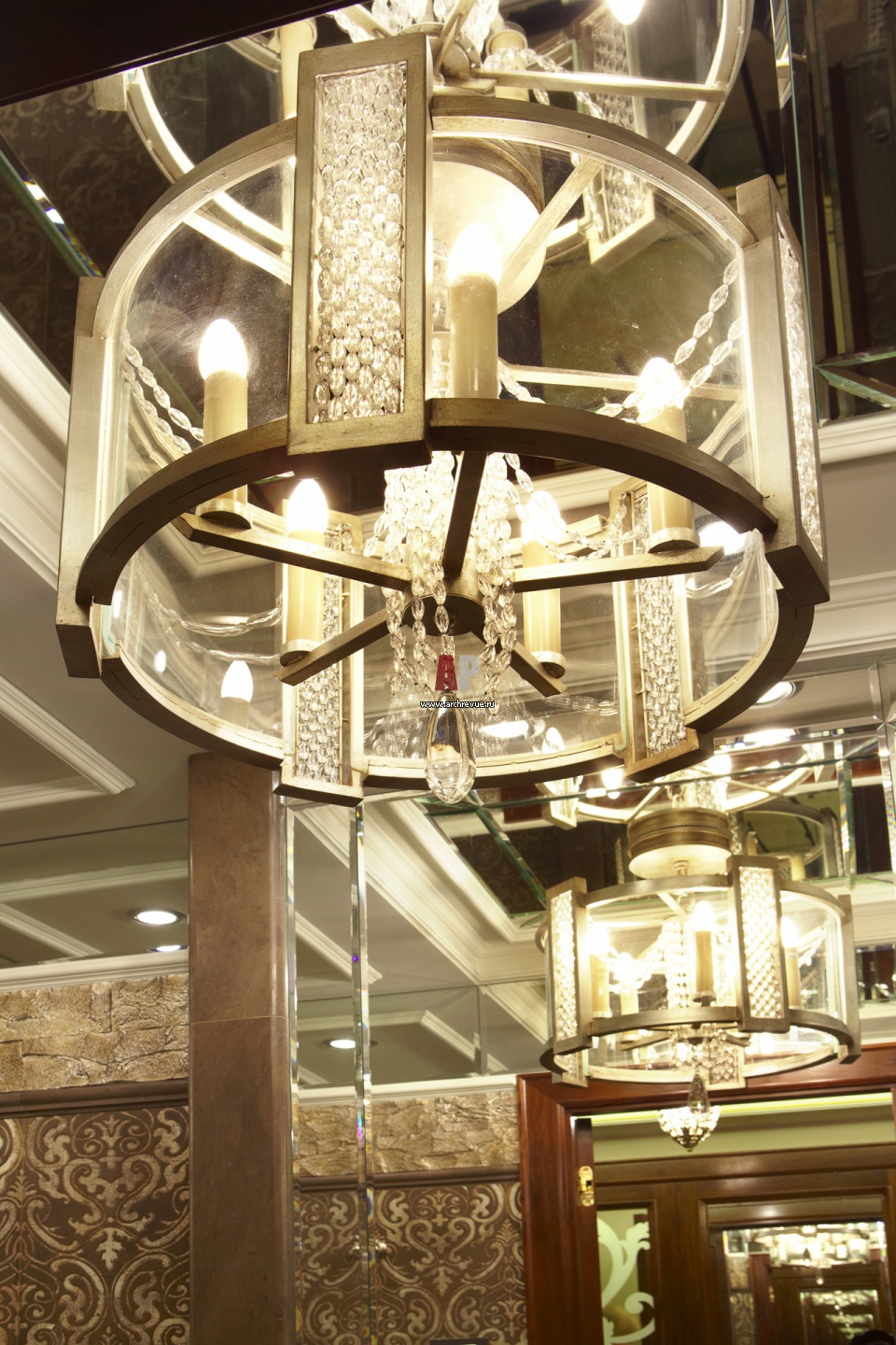 Парадный настрой в гостевом санузле создает золоченая люстра Fine Art Lamps, украшенная хрусталем.