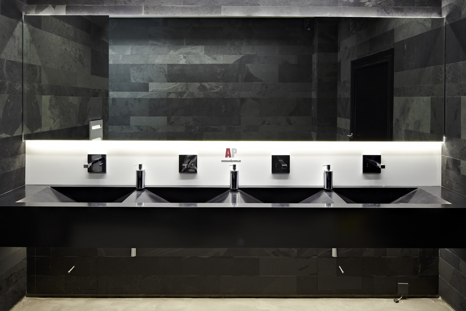 Интерьер санузла в офисе в отделке натуральным черным сланцем.
