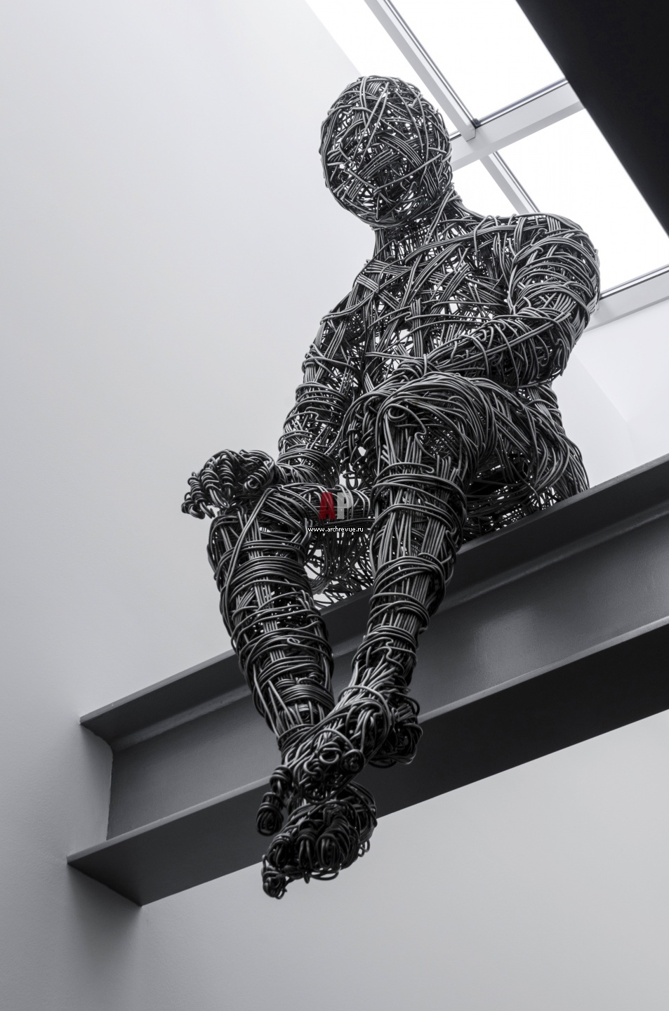 На металлическом перекрытии второго этажа под стеклянным фонарем размещен арт-объект «Железный человек» работы Дмитрия Демидова.