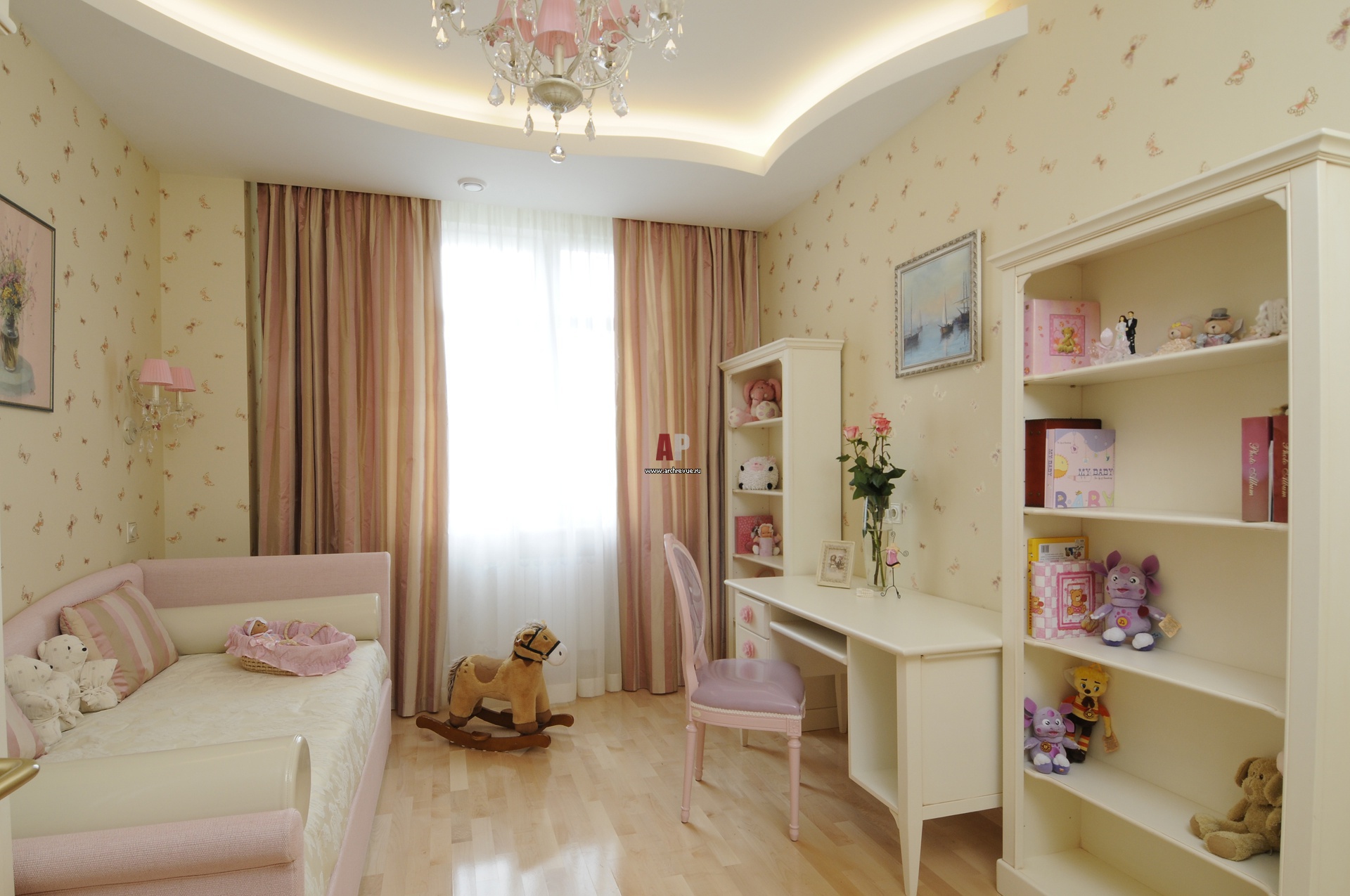 Детская напоминает спальню принцессы во многом благодаря нежным обоям и мебели Halley сливочного оттенка, поставщик «Европейская коллекция». При этом инженерные коммуникации в комнате смонтированы «на вырост» с учетом того, что ребенок повзрослеет и ему потребуются дополнительные розетки для техники, интернета и т. д.