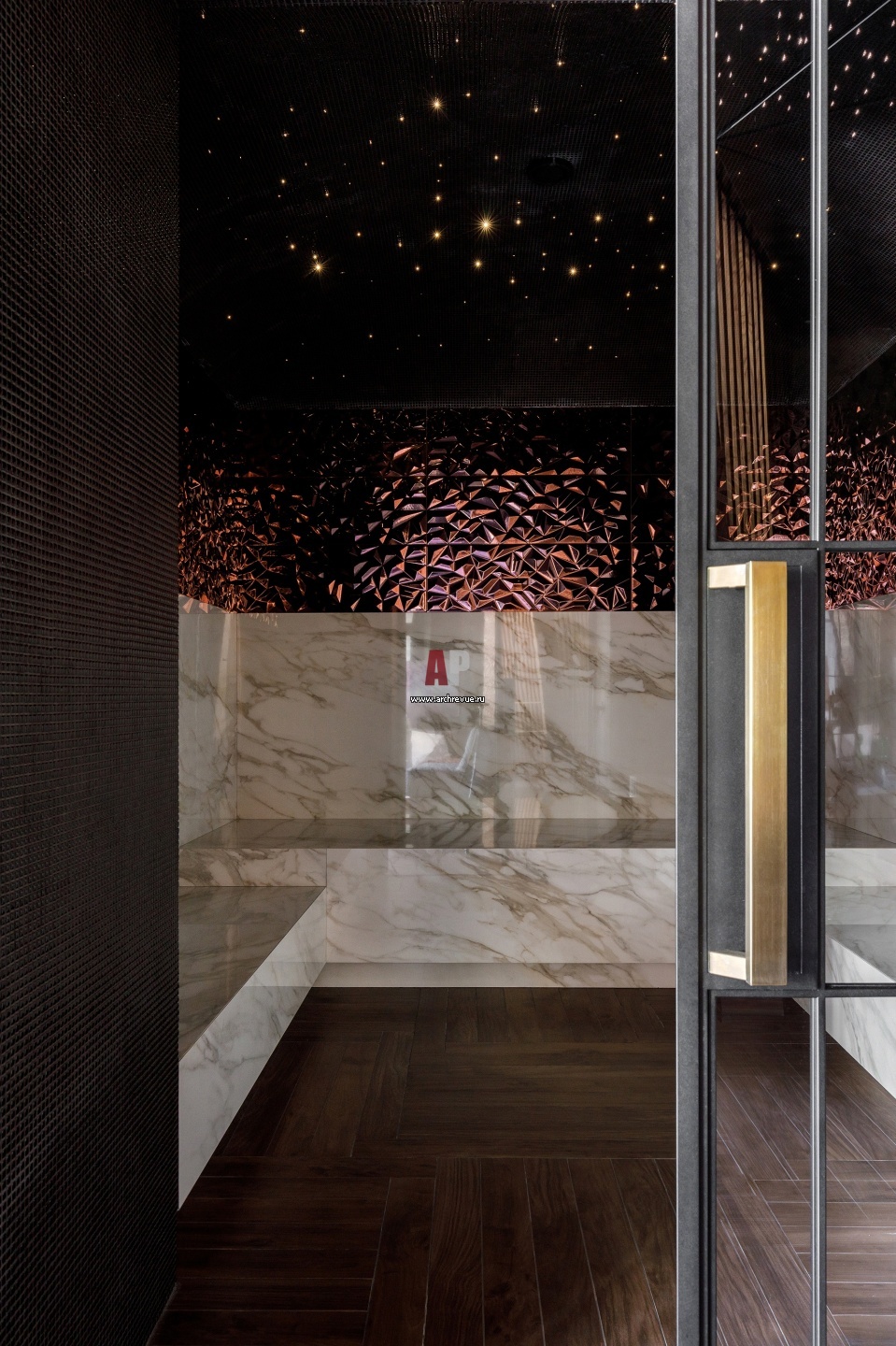 Хаммам отделан мрамором Calacata, плиткой Porcelanosa и мозаикой. На потолке – панели с вкраплением точек мерцающего света.